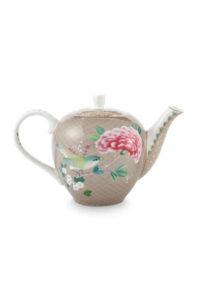 Deze Kleine Khaki Theepot Is Versierd Met Exotische Bloemen, Een Vogel En Gouden Details. Op De Ondergrond Zie Je Een Verfijnd Dessin En Bovenop De Deksel Zit Een Porseleinen Roos. Vormt Een Mooie Combinatie Met Het Theeservies Uit De Blushing Birds Collectie.