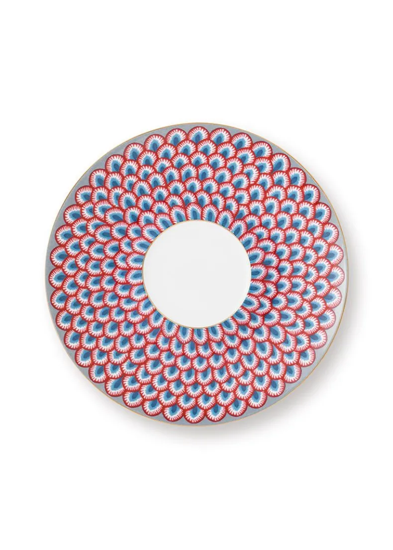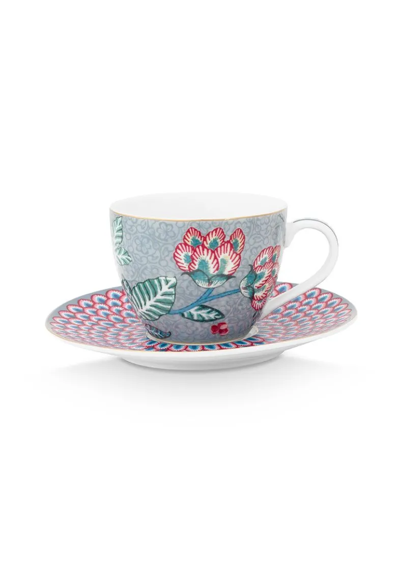 Vul Je Servies Aan Met Deze Flower Festival Espresso Kop & Schotel. Onze Espresso Kop & Schotel Heeft Een Blauwe Achtergrond En Is Versierd Met Het Elegante Flower Festival Dessin. Dit Rijke Bloemendessin Is Opgebouwd Uit Een Variatie Van Fantasierijke Rode En Roze Chintzbloemen Met Lichtblauwe En Groene Bladeren. De Speels Geplaatste Bloementakjes Met Uitgewerkte Gedecoreerde Bloemen En Bladeren Geven Dit Verfijnde Dessin Een Extra Rijke Beleving. Met Ons Flower Festival Porselein Zul Je Jouw Servieskast En Tafel Laten Stralen.