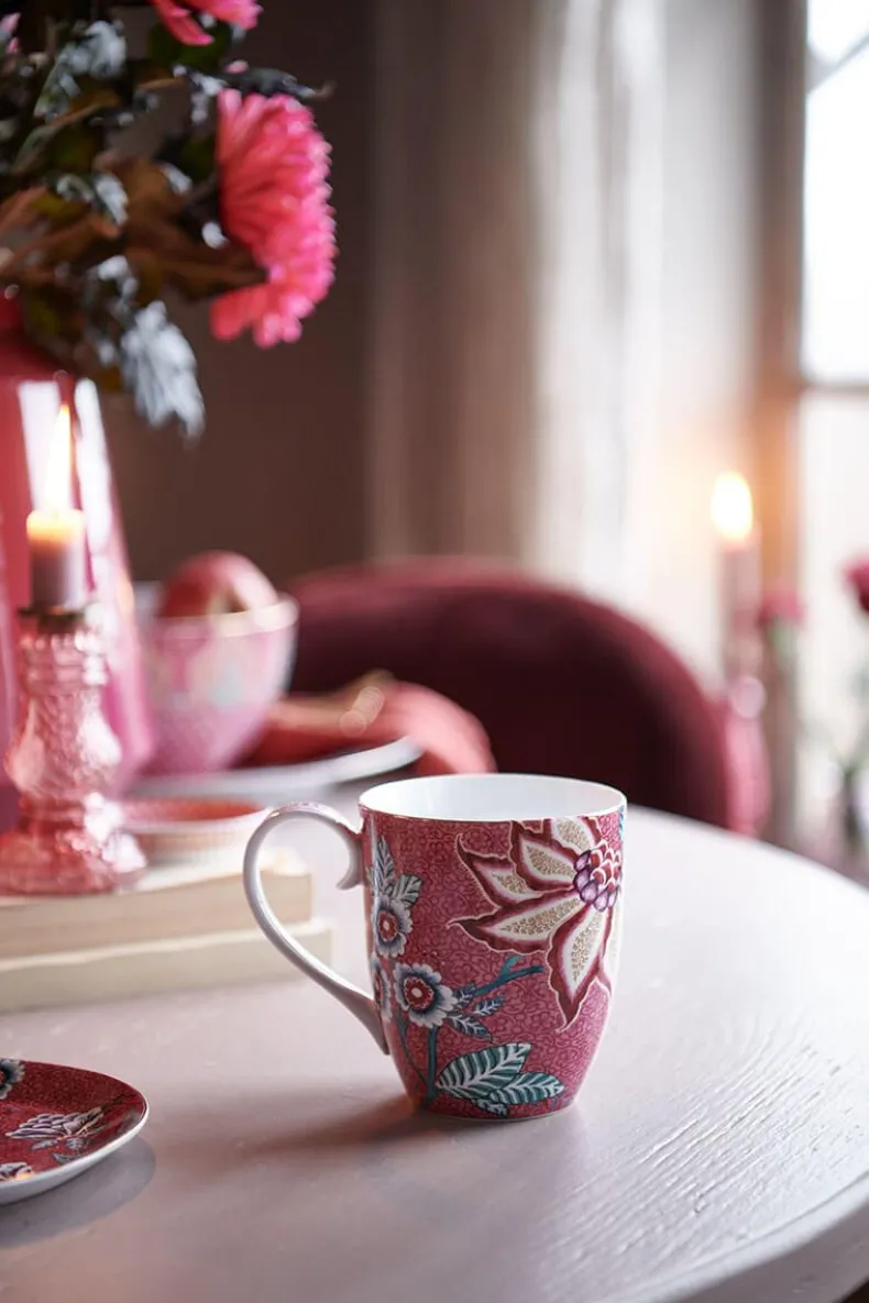 Fleur Je Ontbijt Op Met Deze Set Uit De Flower Festival Collectie. De Set Bestaat Uit Een Ontbijtbord Van 21 Cm, Een Kom Van 15 Cm En Een Grote Mok En Heeft Een Bloemendessin Met Fantasierijke Rode En Roze Chintzbloemen Met Lichtblauwe En Groene Bladeren.