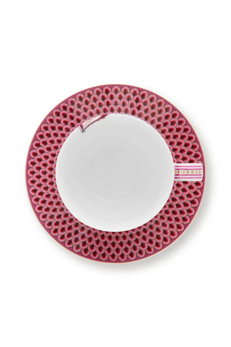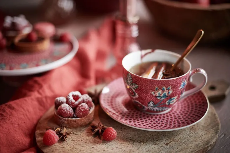 Geniet Van Je Cappuccino Met Deze Set Van 2 Kop & Schotels Uit De Flower Festival Collectie. De Kopjes Hebben Een Bloemendessin Met Fantasierijke Rode En Roze Chintzbloemen Met Lichtblauwe En Groene Bladeren En De Schotels Hebben Een Scallop Dessin.