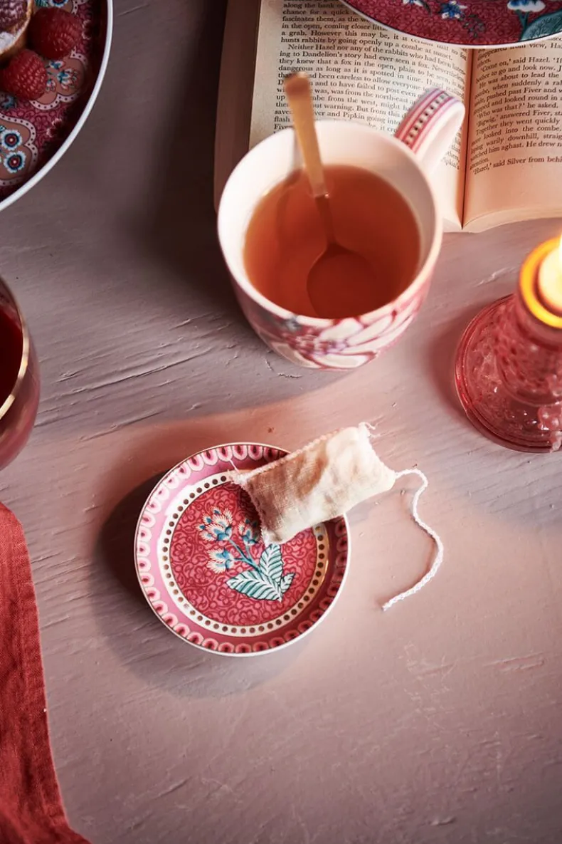 Geniet Van Je Koffie Of Thee Met Deze Set Van 2 Grote Mokken Uit De Flower Festival Collectie. De Mokken Hebben Een Bloemendessin Met Fantasierijke Rode En Roze Chintzbloemen Met Lichtblauwe En Groene Bladeren.