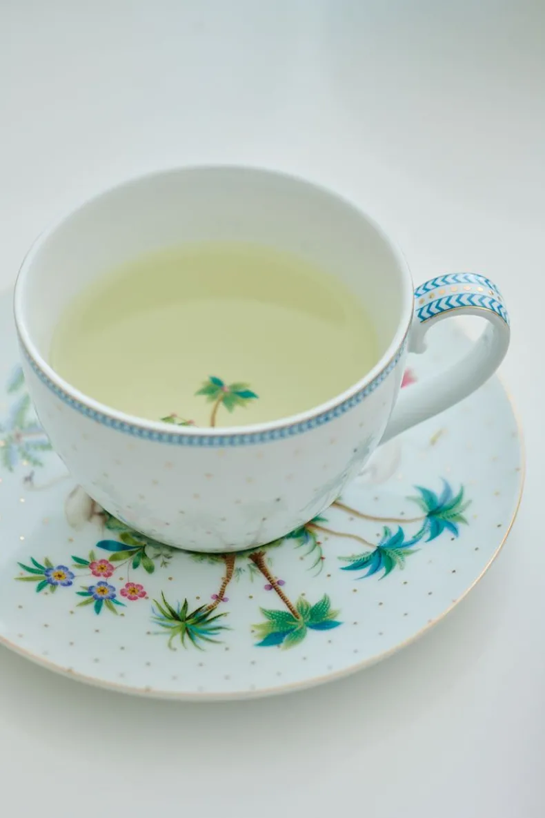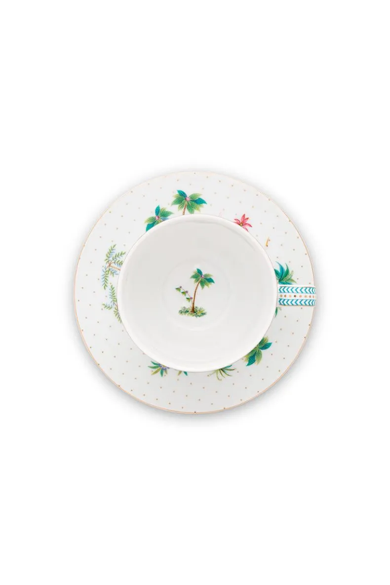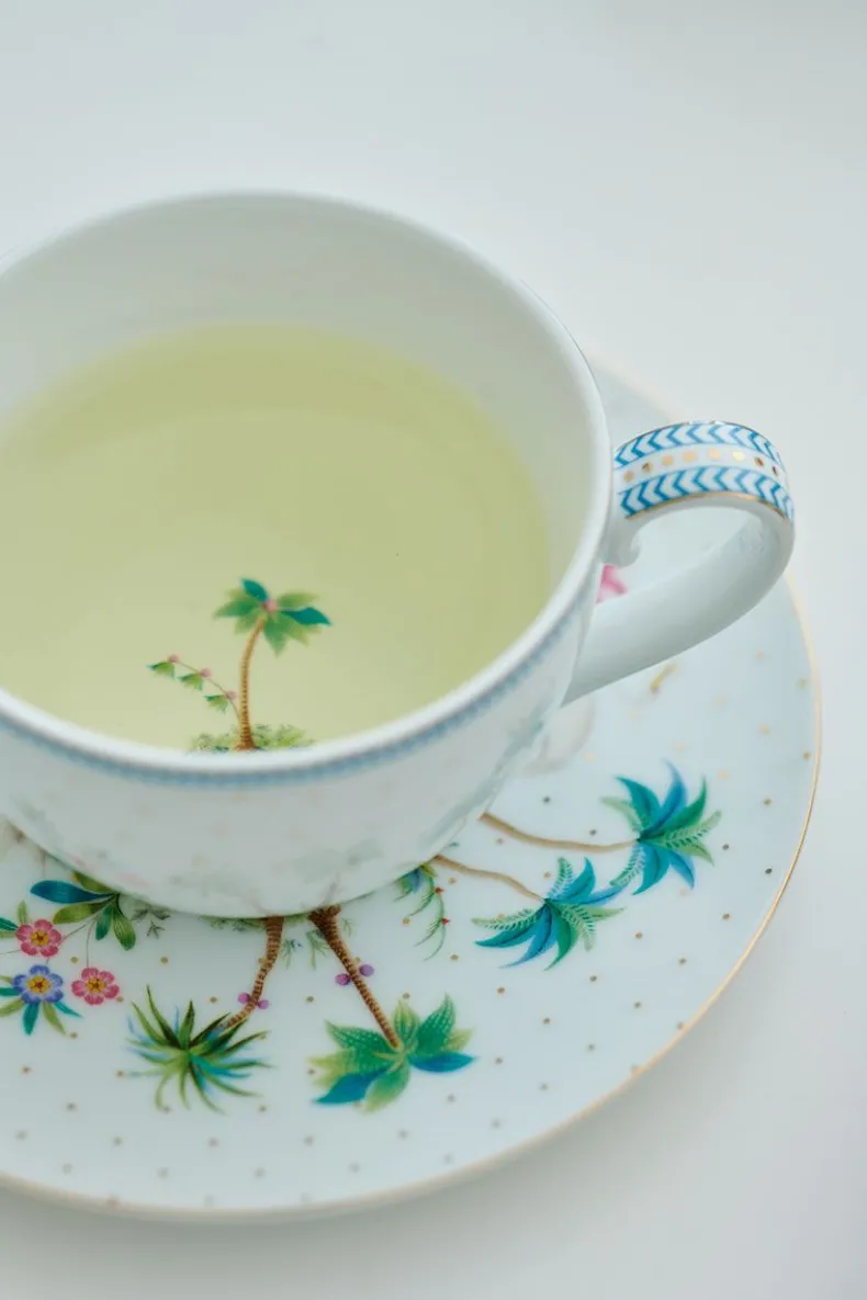 Een Perfecte Mok Voor Al Je Warme Dranken. Deze Jolie Kop & Schotel Geeft Je Een Feestelijke En Tropische Vibe Door Zijn Mooie Decoratie. Op De Witte Achtergrond Vind Je Gouden Stippen En Een Gouden Detail Op De Rand. Verder Is De Mok Versierd Met Palmbomen, Kleurrijke Bloemen En Exotische Soorten. Het Handvat Van De Mok Is Versierd Met Blauwe Details, Die Perfect Passen Bij De Tropische Vibes.