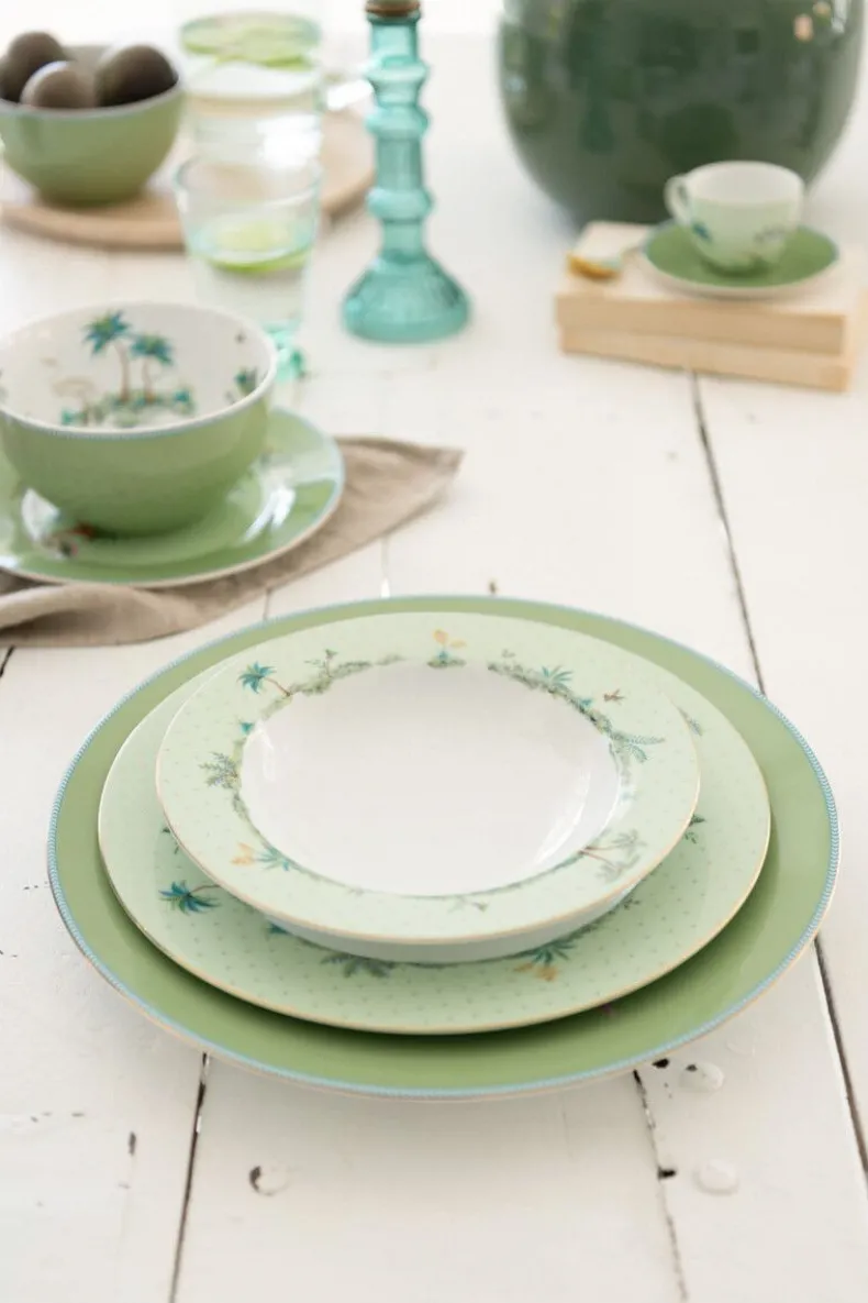 Dineren Met Het Gezin Of Met Vrienden? Dit Diepe Bord Is Perfect Te Gebruiken Voor Het Voorgerecht. Het Diepe Bord Heeft Een Groene Achtergrond Met Gouden Stippen En Is Rond Het Midden Versierd Met Exotische Planten. Perfect Te Combineren Met De Andere Borden Uit De Jolie-Collectie.
