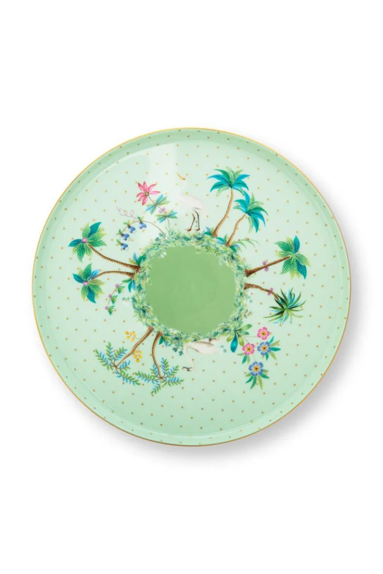 Gebruik Dit Taartplateau Bij Een High Tea Met Vrienden Om Een Heerlijke Cake Te Laten Zien. De Basis Van Het Taartplateau Is Groen, Wat De Schaal Een Elegante Uitstraling Geeft. Bovendien Geeft Het Taartplateau Je Het Gevoel Van Een Tropisch Eiland Door Zijn Design. In Het Midden Vind Je Verschillende Planten, Bloemen En Prachtige Palmbomen.