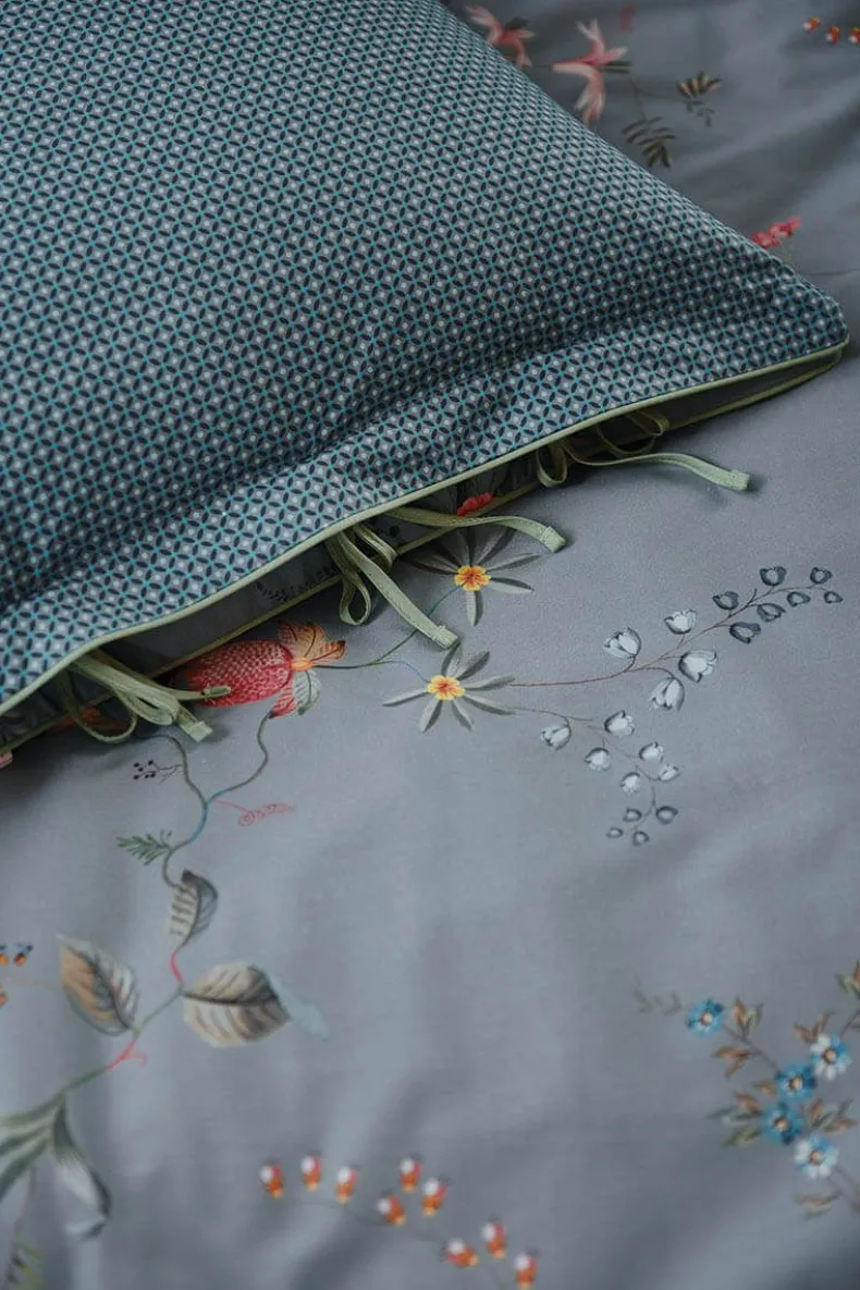 Dit Kussensloop In Blauw Is Geprint Met Het Fleur Grandeur Dessin. Deze Print Is Opgebouwd Uit Elegante Siertakken En Fantasiebladeren. Het Kussen Bevat Een Doorgestikte Rand, Striksluiting En Is Afgewerkt Met Een Gekleurde Bies. De Achterkant Is Geprint Met Een Boogjes Dessin, Hierdoor Kan Het Kussen Dubbelzijdig Gebruikt Worden.