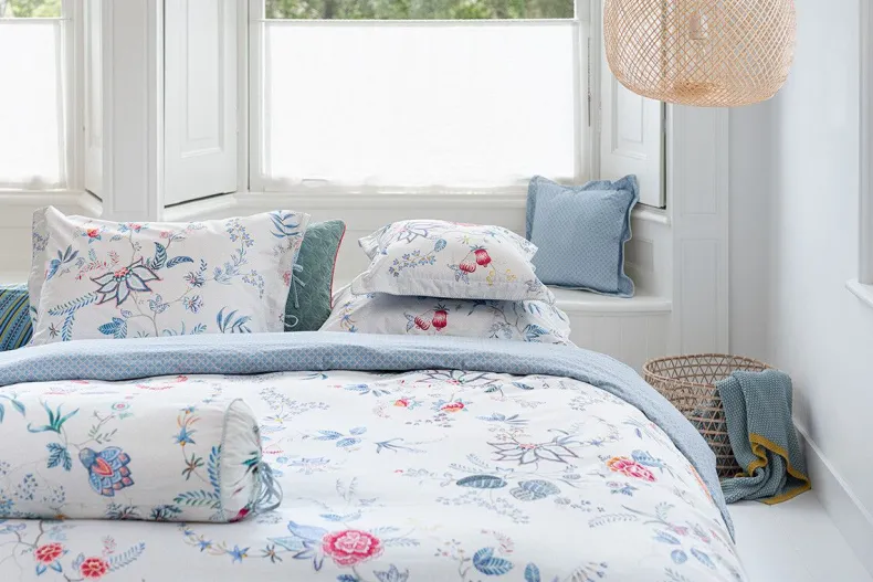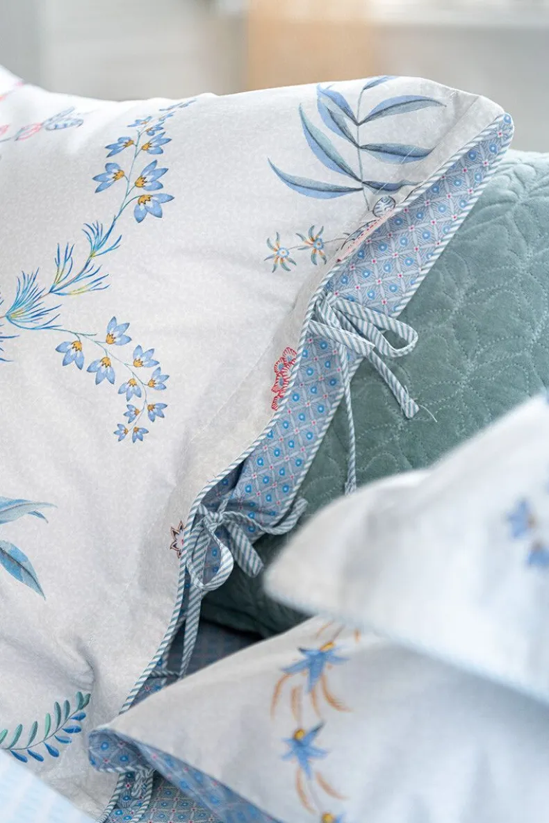 Het Witte Kussensloop Flower Festival Bestaat Uit Een Rijk Bloemendessin, Opgebouwd Uit Een Variatie Van Fantasierijke Rode En Roze Chintzbloemen Met Lichtblauwe En Groene Bladeren. De Speels Geplaatste Bloementakjes Met Grote Uitgewerkte Gedecoreerde Bloemen En Bladeren Geven Dit Verfijnde Dessin Een Extra Rijke Beleving.