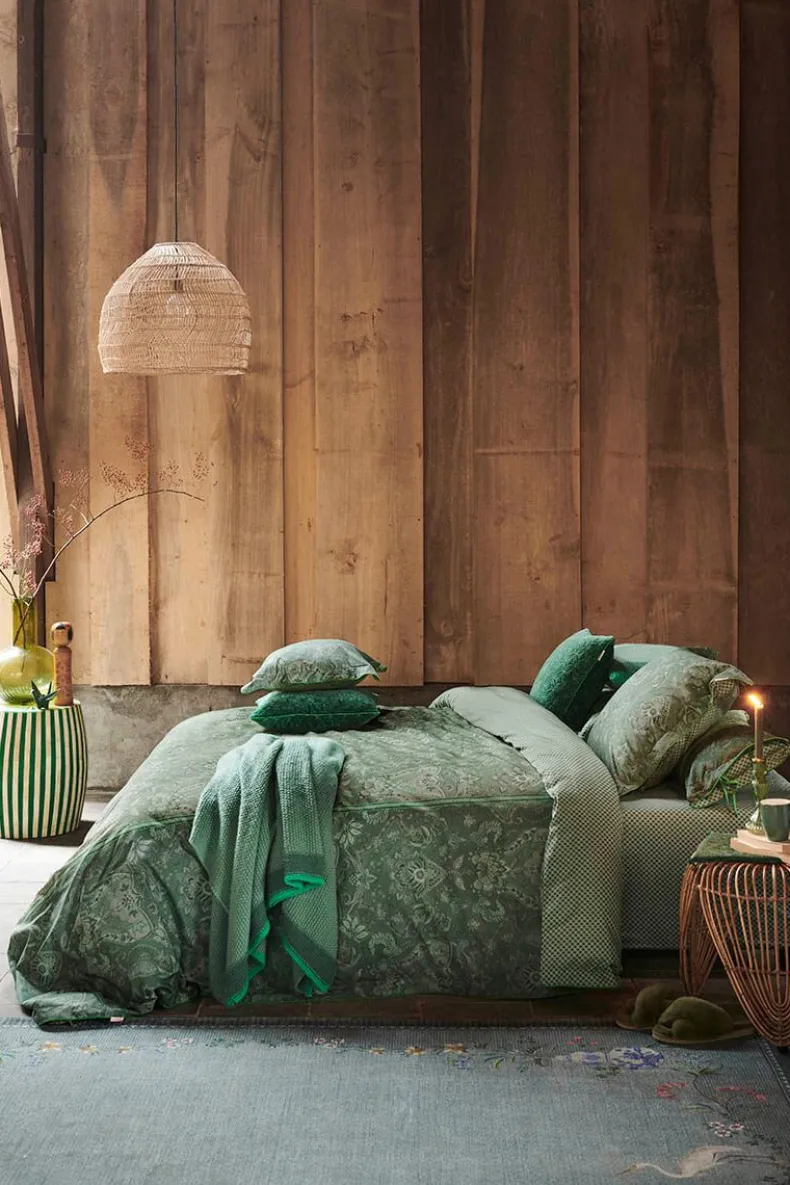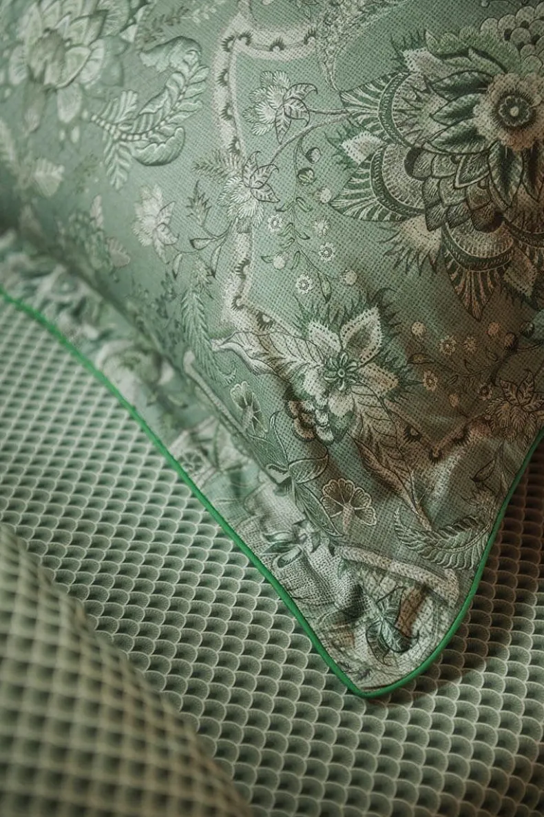 Dit Kussensloop In Groen Is Geprint Met Het Kyoto Nights Dessin. Deze Print Is Opgebouwd Uit Symmetrisch Geplaatste Bloemen En Ornamenten. Het Kussen Bevat Een Doorgestikte Rand,Knoopsluiting En Is Afgewerkt Met Een Fel Gekleurde Bies. De Achterkant Is Geprint Met Een Boogjes Dessin, Hierdoor Kan Het Kussen Dubbelzijdig Gebruikt Worden.