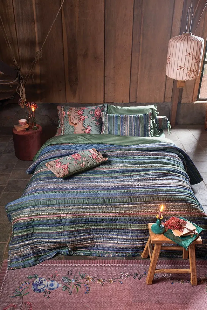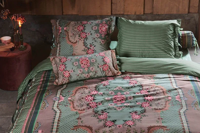 Dit Kussensloop In Groen Is Geprint Met Het Pip Chique Dessin. This Print Is Inspired By Classic Carpets And Features Rosettes, Fantasy Flowers And A Variation Of Bows, Checks And Stripes. Het Kussen Bevat Een Oxford Rand En Striksluitingen Is Afgewerkt Met Een Gestreepte Bies. De Achterkant Is Geprint Met Een Streepjes Dessin, Hierdoor Kan Het Kussen Dubbelzijdig Gebruikt Worden.