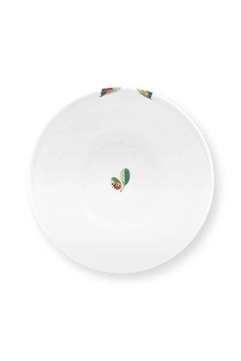 Deze Roze Kom Is Rondom Versierd Met Exotische Bloemen En Een Palmboom Op Een Gele Achtergrond.