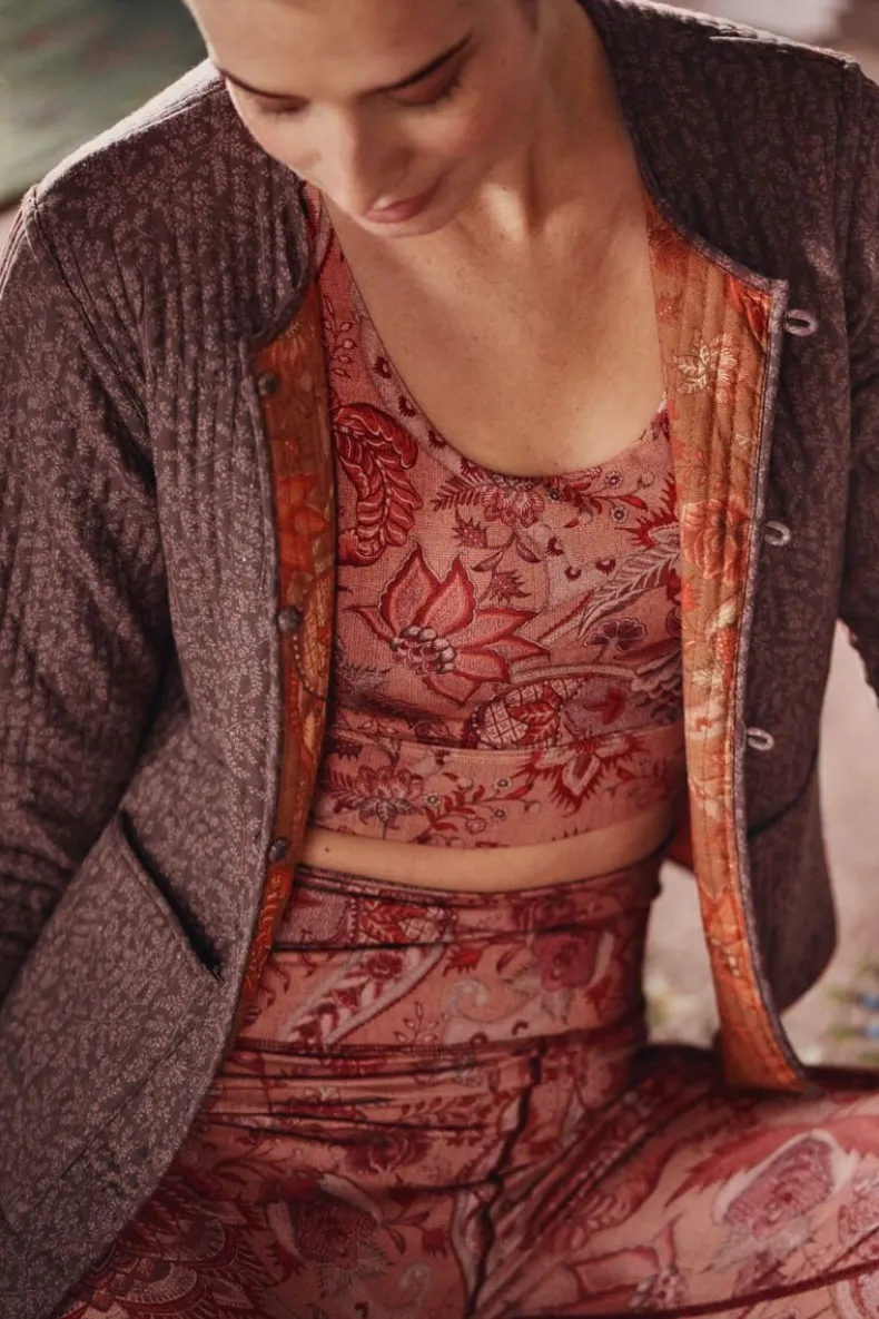 Deze Lange Sportlegging In Het Terra Roze Is Uitgevoerd Met Het Vrolijke Kyoto Festival Dessin. Het Herhaalde Bloemdessin Is Opgebouwd Uit Een Variatie Van Fantasierijke Chintz Bloemen En Bladeren. De Legging Is Gemaakt Van Een Elastische Stof Voor Een Comfortabele En Flaterende Fit.