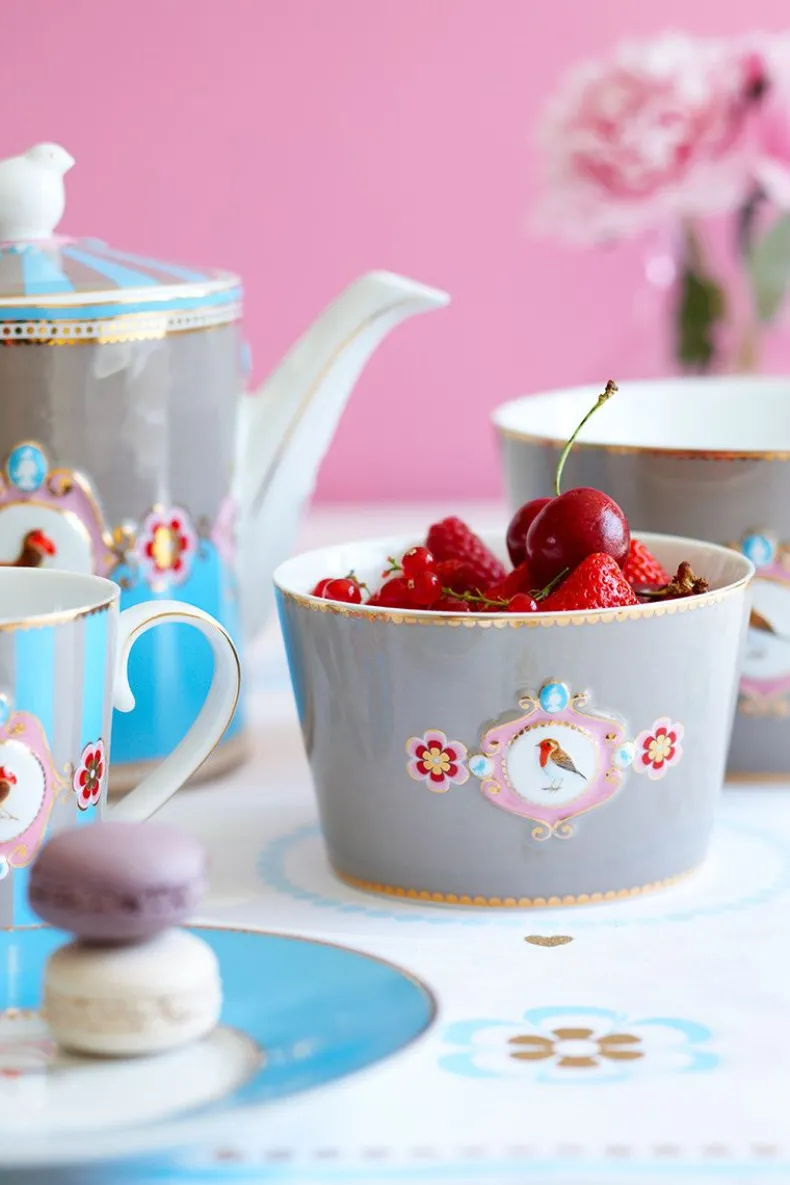 Een Blauw-Khaki Gekleurde Theepot Met Pip’S Favoriete Love Birds Dessin. Decoratief Afgewerkt Met Gouden Gekrulde Elementen Met Het Strakke Dessin Van Zowel Strepen Als Vormen. De Theepot Heeft In Het Midden Een Medaillon Met Een Geschilderde Vogel, Een Roodborstje. Bovenop Wordt De Theepot Bekroond Met Een Vogel.