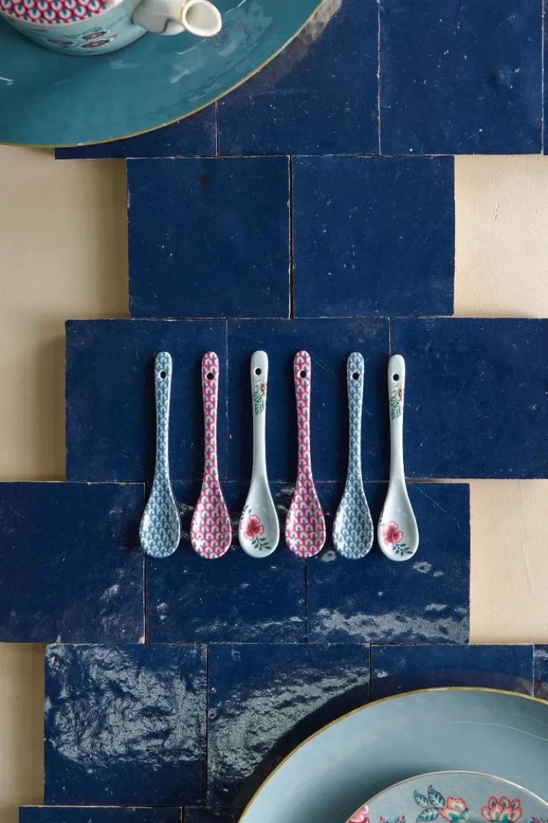 Vul Je Servies Aan Met Deze Flower Festival Theelepels. Deze Set Van 6 Verschillende Theelepels Heeft Een Lichtblauwe Achtergrond En Is Versierd Met Het Elegante Flower Festival Dessin. Dit Rijke Bloemendessin Is Opgebouwd Uit Een Variatie Van Fantasierijke Rode En Roze Chintzbloemen Met Lichtblauwe En Groene Bladeren. Met Ons Flower Festival Porselein Zul Je Jouw Servieskast En Tafel Laten Stralen.