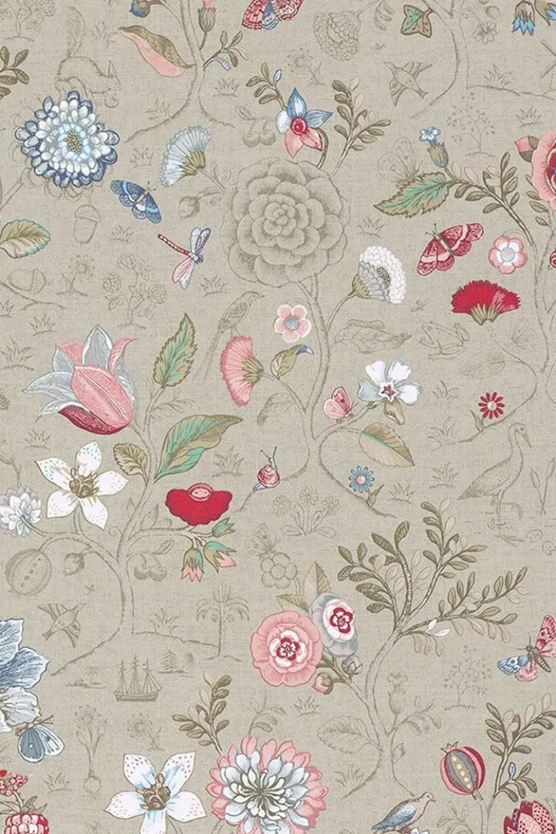 Dit Kaki Behang Met Levendig Spring To Life Patroon Transformeert Elke Kamer In Het Huis Tot Een Stijlvolle Ruimte. De Combinatie Van Bloemen, Planten En Vogels Creeert Een Verhalend Karakter En Een Unieke Sfeer.