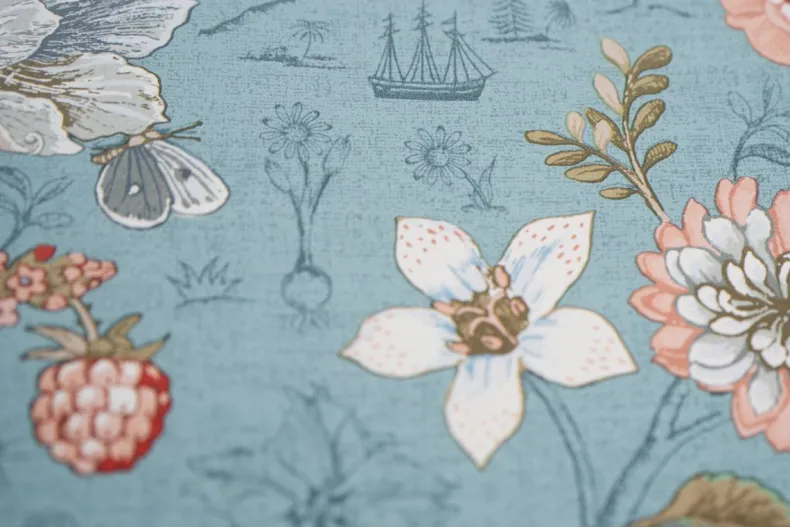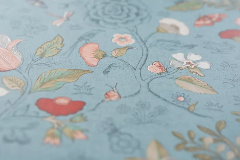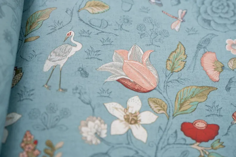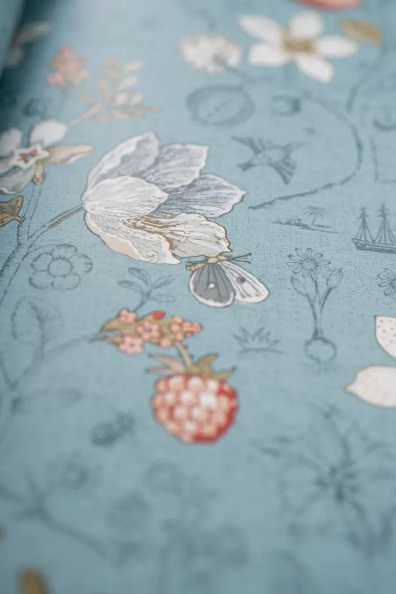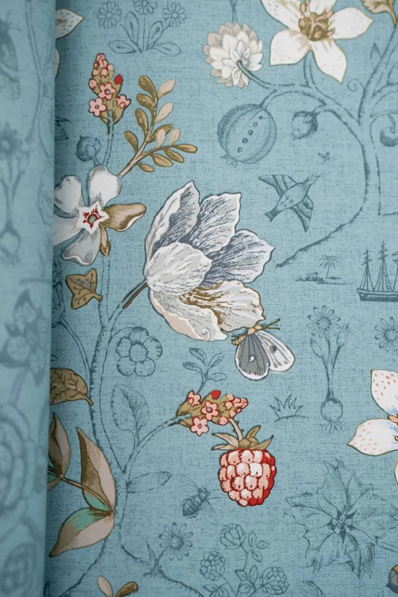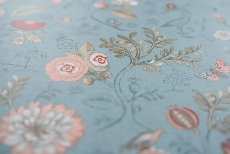 Dit Zeeblauwe Behang Met Levendig Spring To Life Patroon Transformeert Elke Kamer In Het Huis Tot Een Stijlvolle Ruimte. De Combinatie Van Bloemen, Planten En Vogels Creeert Een Verhalend Karakter En Een Unieke Sfeer.