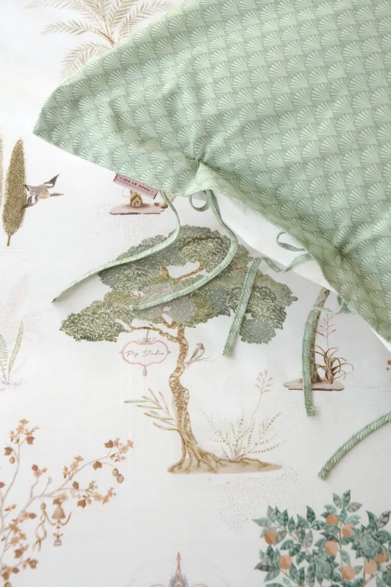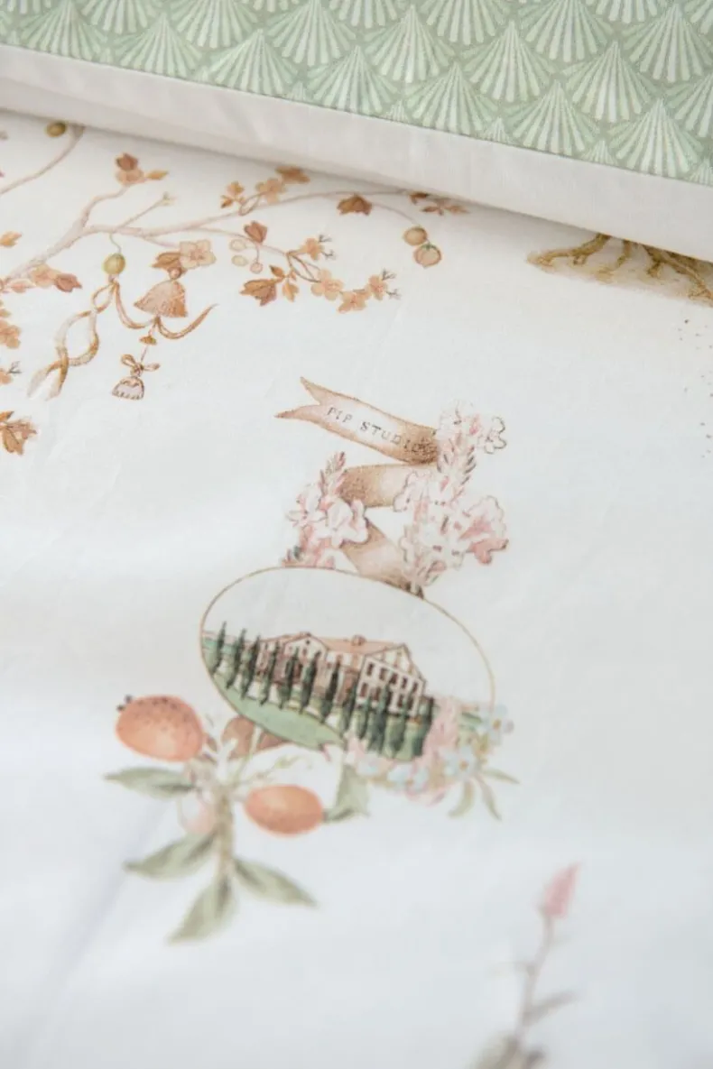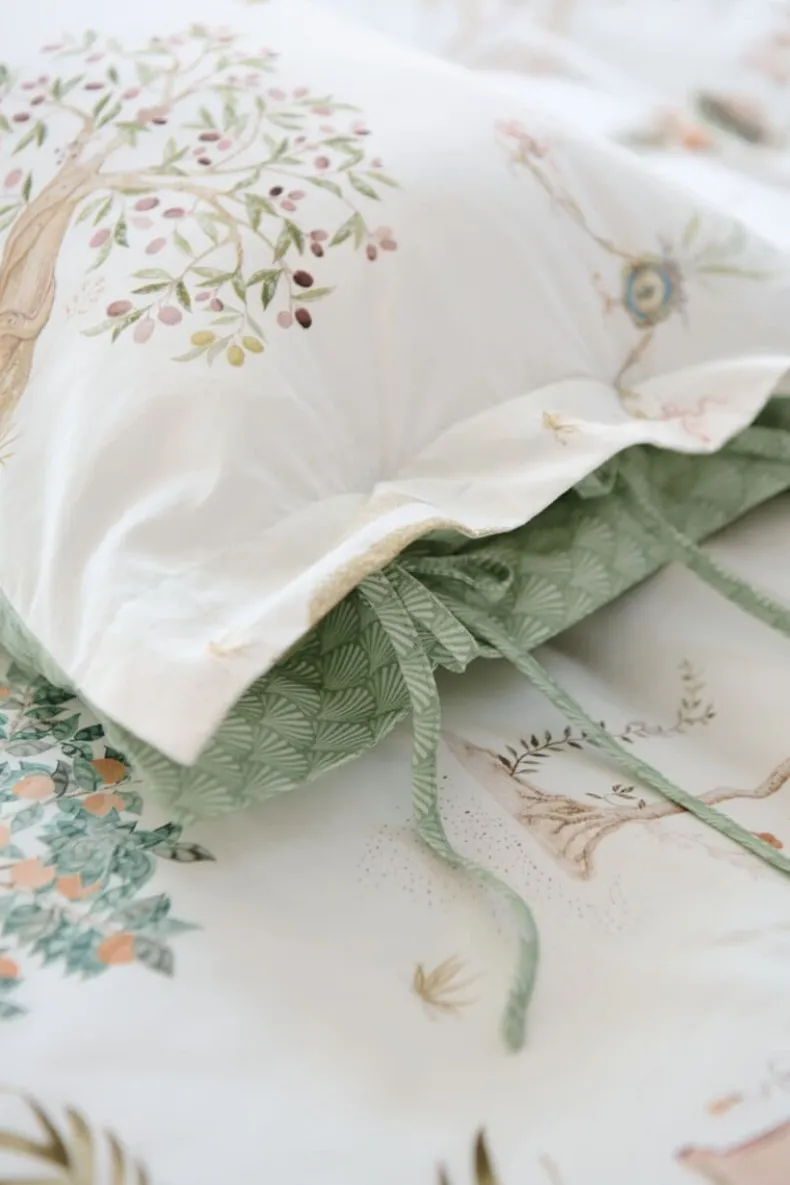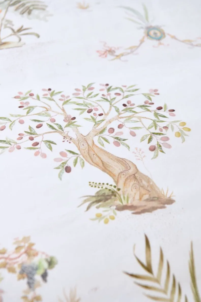 Met Dit Witte Dekbedovertrek Giardini Di Frutta Waan Je Jezelf Op Het Italiaanse Platteland. Het Dessin Bevat Een Mix Van Palm- En Fruitbomen En Tussen De Bomen Zijn Verwijzingen Naar Het Italiaanse Buitenleven Te Vinden Zoals Fonteinen, Terracotta Potten En Guirlandes En Hier En Daar Een Olijfplukker. De Onderkant Van Het Dekbed Heeft Een Decoratieve Rand Die Overgaat In Een Bloemenprint. De Achterkant Heeft Een Patroon Van Gestileerde Schelpen. Het Overtrek En De Kussens Hebben Een Doorgestikte Rand Aan De Zijkanten En Zijn Afgewerkt Met Een Gestreepte Bies, Wat Een Luxe Uitstraling Geeft. Dankzij De Verschillende Zijdes Kan Je Ze Op Twee Manieren Gebruiken En Zo Creeer Je Een Speels Mix & Match Effect Op Je Bed.