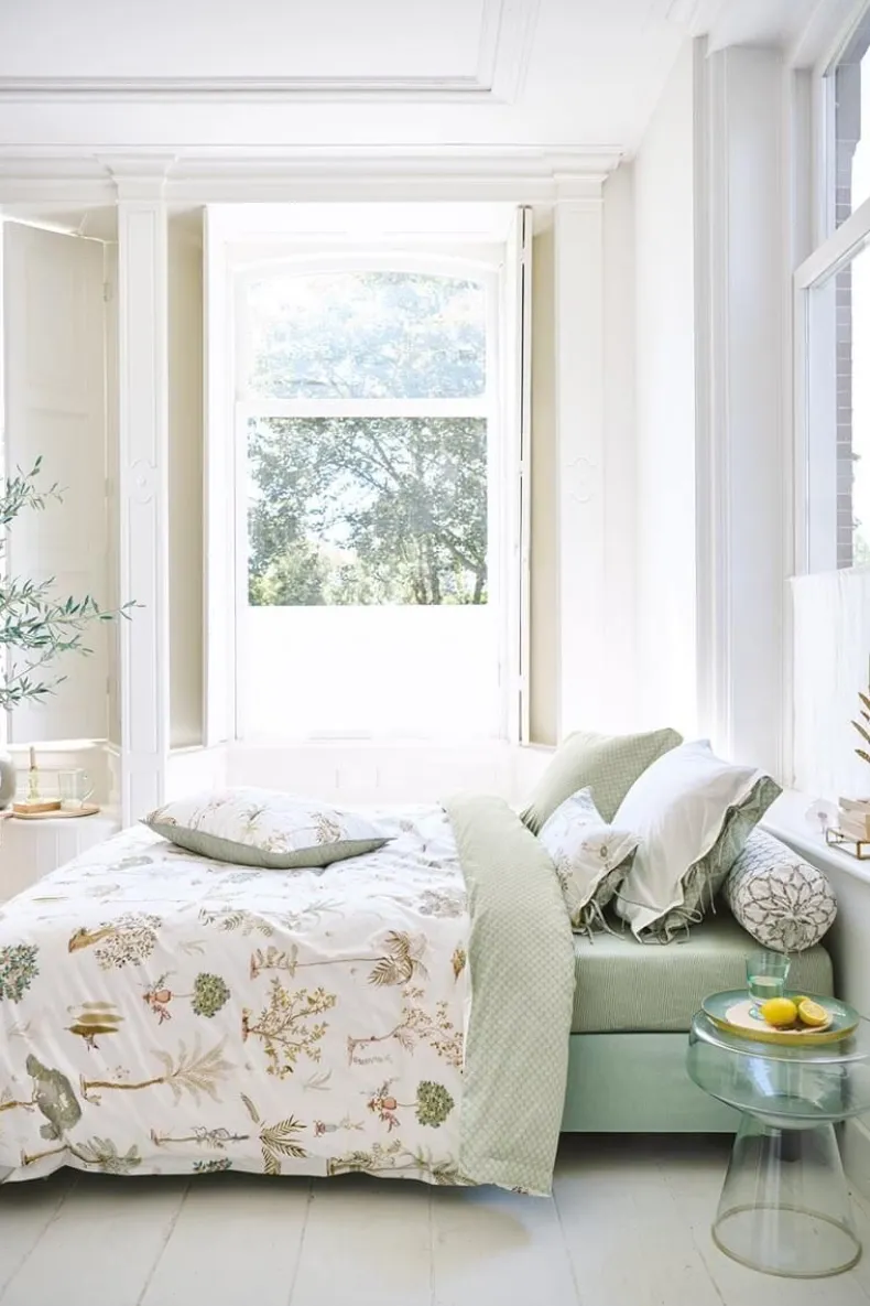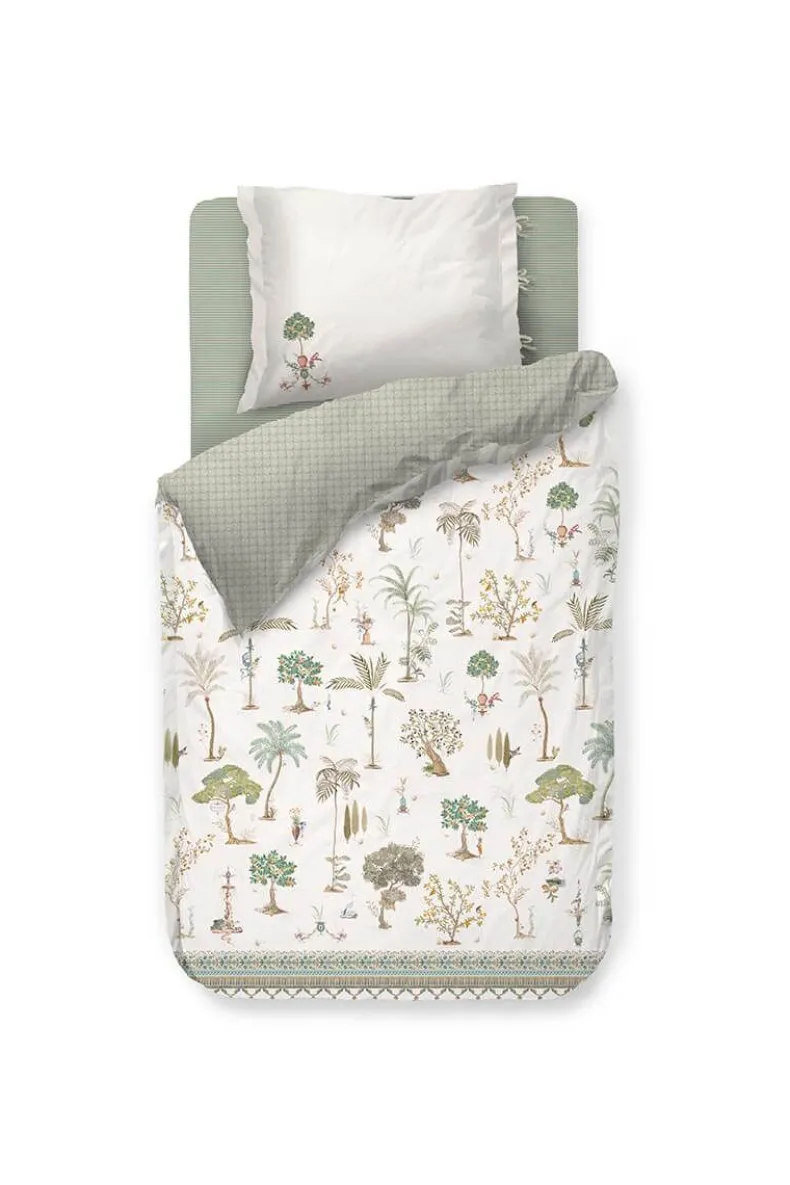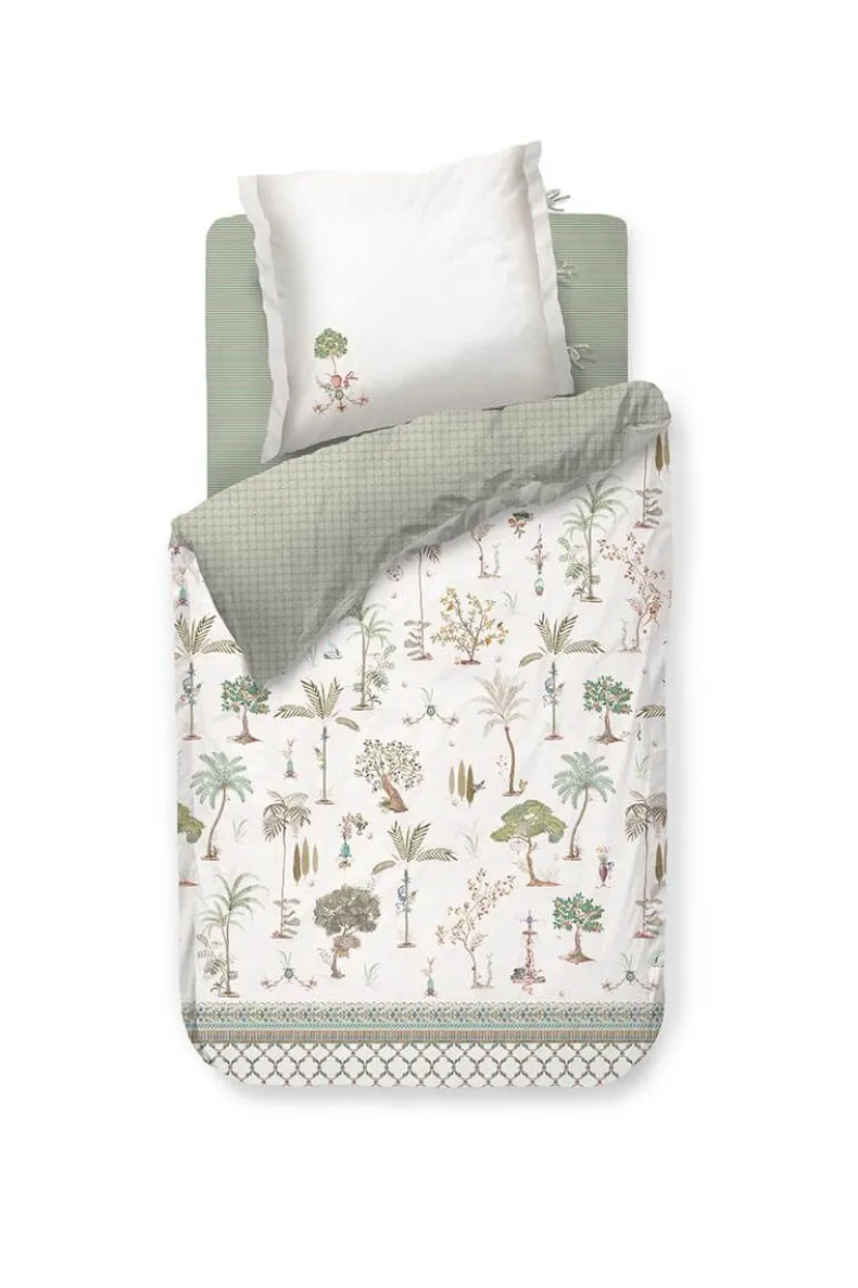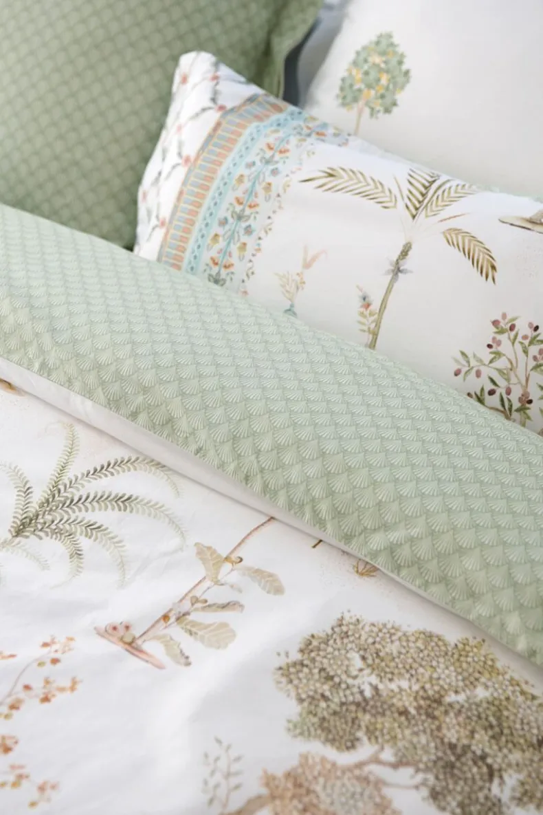 Met Dit Witte Dekbedovertrek Giardini Di Frutta Waan Je Jezelf Op Het Italiaanse Platteland. Het Dessin Bevat Een Mix Van Palm- En Fruitbomen En Tussen De Bomen Zijn Verwijzingen Naar Het Italiaanse Buitenleven Te Vinden Zoals Fonteinen, Terracotta Potten En Guirlandes En Hier En Daar Een Olijfplukker. De Onderkant Van Het Dekbed Heeft Een Decoratieve Rand Die Overgaat In Een Bloemenprint. De Achterkant Heeft Een Patroon Van Gestileerde Schelpen. Het Overtrek En De Kussens Hebben Een Doorgestikte Rand Aan De Zijkanten En Zijn Afgewerkt Met Een Gestreepte Bies, Wat Een Luxe Uitstraling Geeft. Dankzij De Verschillende Zijdes Kan Je Ze Op Twee Manieren Gebruiken En Zo Creeer Je Een Speels Mix & Match Effect Op Je Bed.