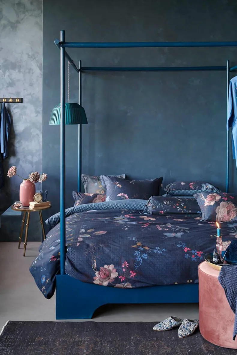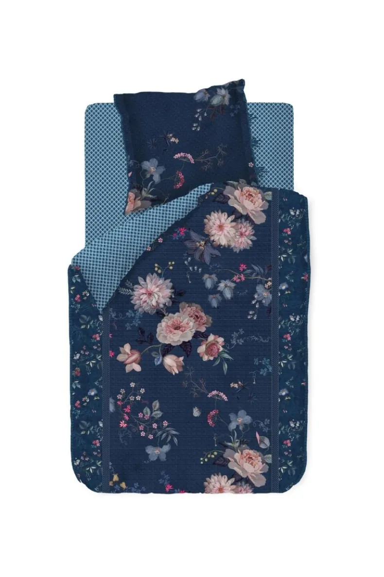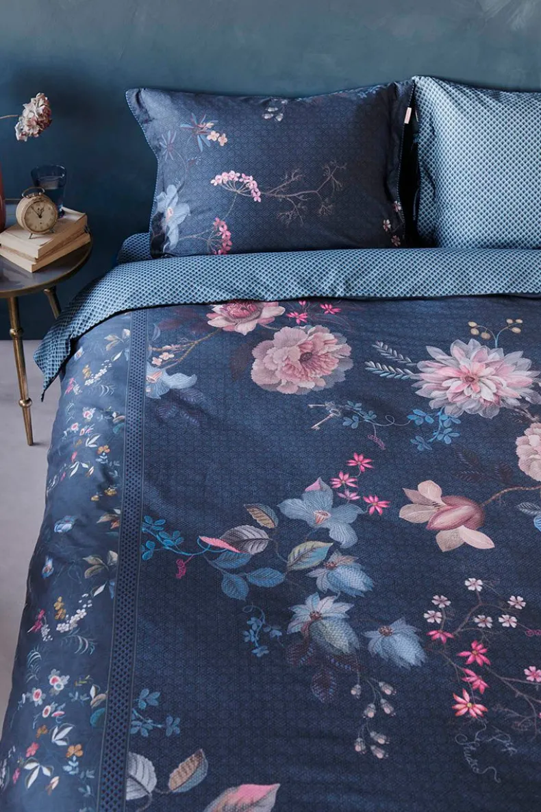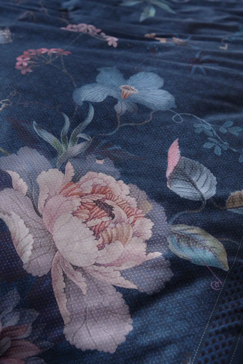 Dit Dekbedovertrek In Het Donkerblauw Is Geprint Met Het Tokyo Bouquet Dessin. Deze Print Is Opgebouwd Uit Elegante Takken En Zwierige Fantasie Bloemen. Het Dekbed Bevat Een Doorgestikte Rand, Striksluiting En Is Afgewerkt Met Een Gestreepte Bies. De Achterkant Is Donkergroen, Geprint Met Een Boogjes Dessin, Hierdoor Kan Het Kussen Dubbelzijdig Gebruikt Worden.