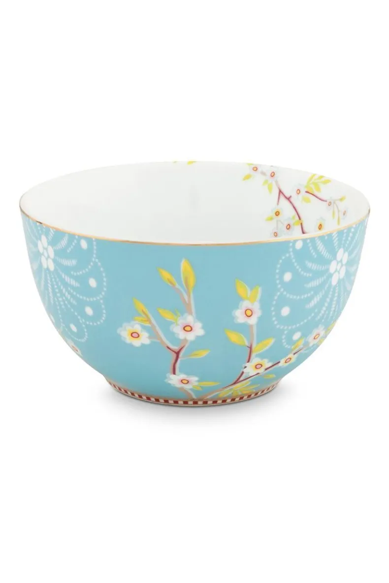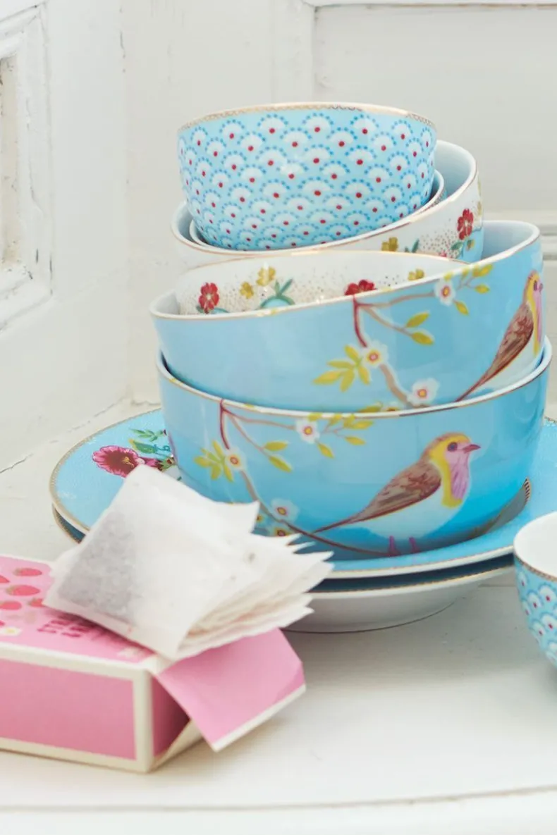 Deze Lichtblauwe Kom Is Gedecoreerd Met Het Early Bird Dessin: Een Vogel En Verfijnde Bloesemprint, Die Doorloopt Aan De Binnenzijde. Afgewerkt Met De Bekende Rood-Wit Gestreepte Pip Rand Met Gouden Details.