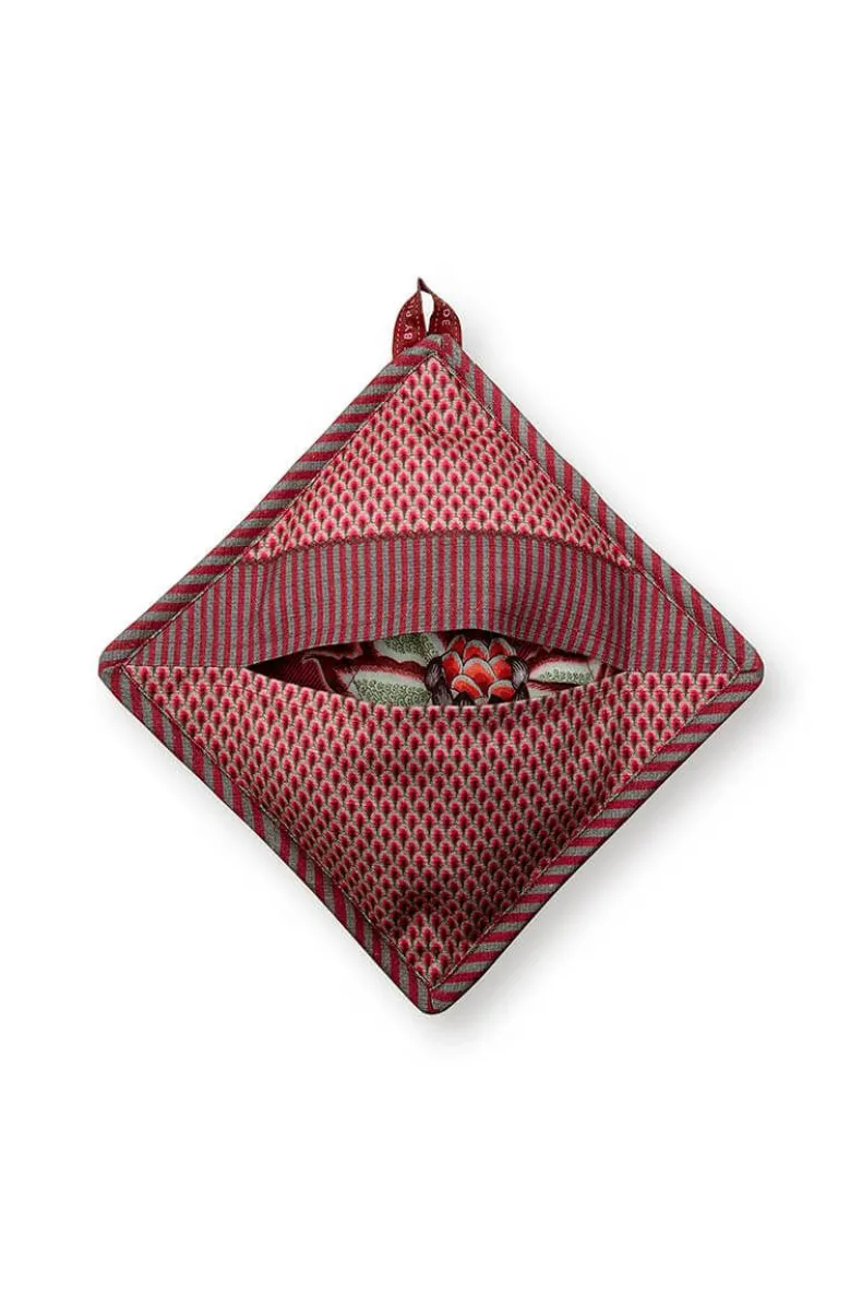 Vul Je Keukentextiel Aan Met Deze Pannenlap Uit De Flower Festival Collectie. De Pannenlap Heeft Een Bloemendessin Met Fantasierijke Rode En Roze Chintzbloemen Met Lichtblauwe En Groene Bladeren.