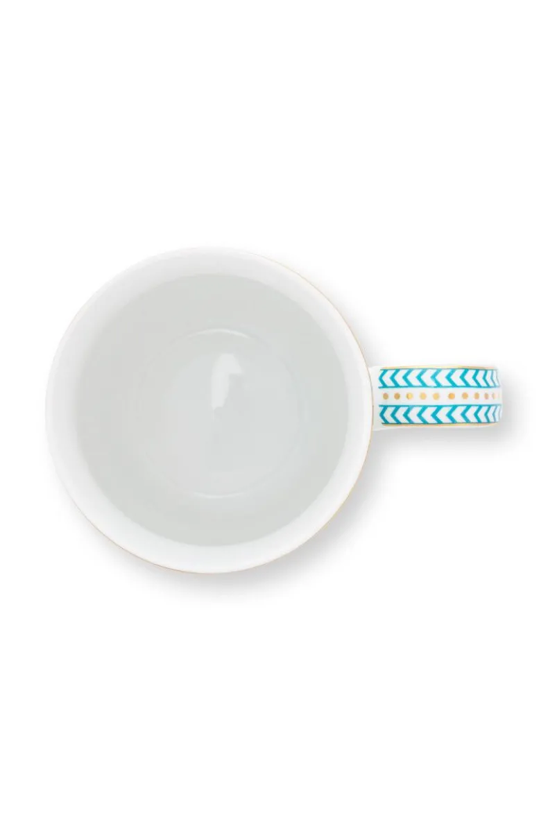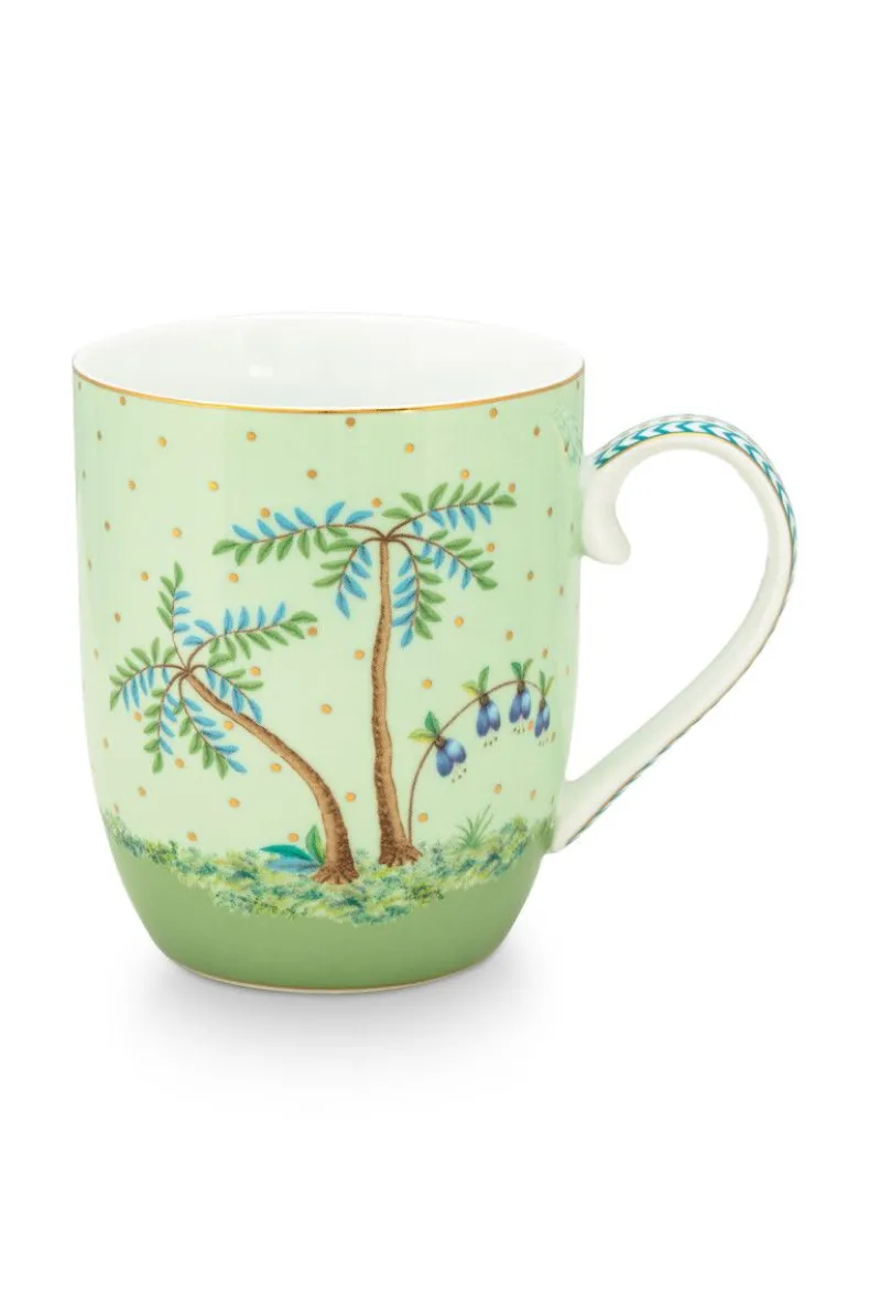 Een Mok Uit Onze Tropische Jolie-Collectie. Deze Mooie Mok Heeft Een Groene Achtergrond Met Gouden Stippen. Waan Je Op Een Tropisch Eiland En Bekijk De Palmbomen En Tropische Planten Die Op Deze Mok Zijn Gedecoreerd. Perfect Om Je Serviesgoed Mee Op Te Fleuren. Het Handvat Van De Mok Is Versierd Met Elegante Blauwe Details. Deze Mok Is Ook Verkrijgbaar In Een Grote Versie Die Perfect Te Combineren Is Voor Een Speels Effect Op Je Tafel. Of Combineer Deze Mok Met De Andere Mokken Uit De Jolie-Collectie Met Een Andere Kleurrijke Print.