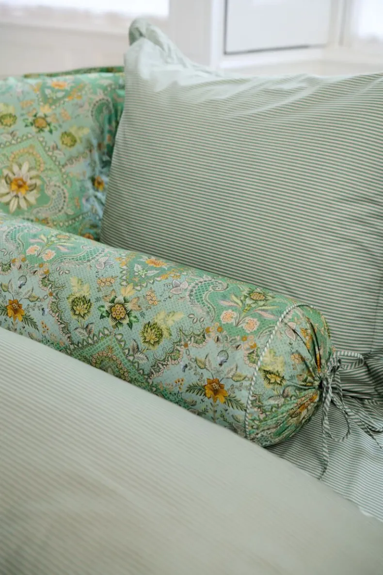 Het Saluti Piccoli Kussensloop Bestaat Uit Een Symmetrisch Opgebouwd Bloemenpatroon, Geinspireerd Op De Prachtige Behangmotieven Uit Italie. De Verfijnde Bloemen Zijn Geschilderd In Tonale Kleuren Met Hier En Daar Een Accentkleur. De Achterkant Heeft Een Patroon Van Groene En Khaki Horizontale Streepjes. Het Sierkussensloop Heeft Een Doorgestikte Oxford Rand Aan De Zijkanten, Wat Een Luxe Uitstraling Geeft. Het Kussensloop Kun Je Tweezijdig Gebruiken.