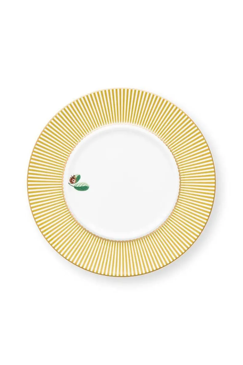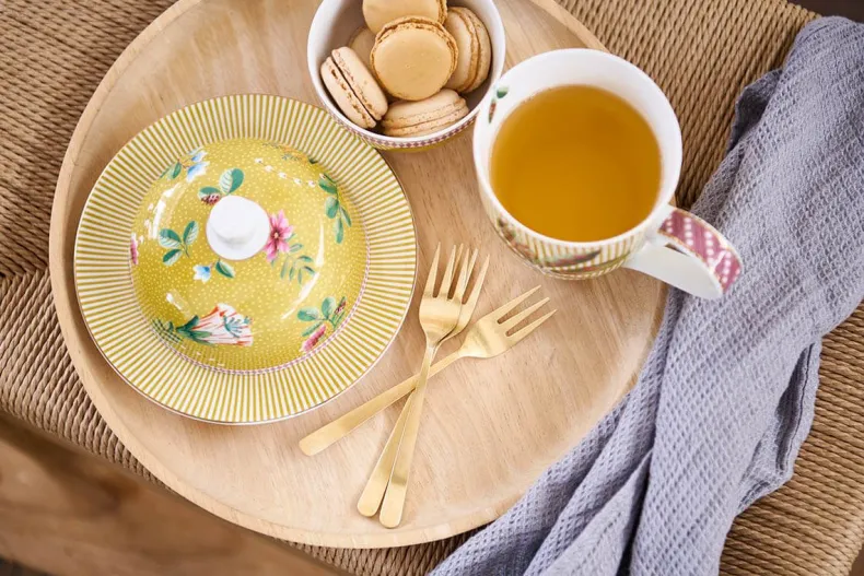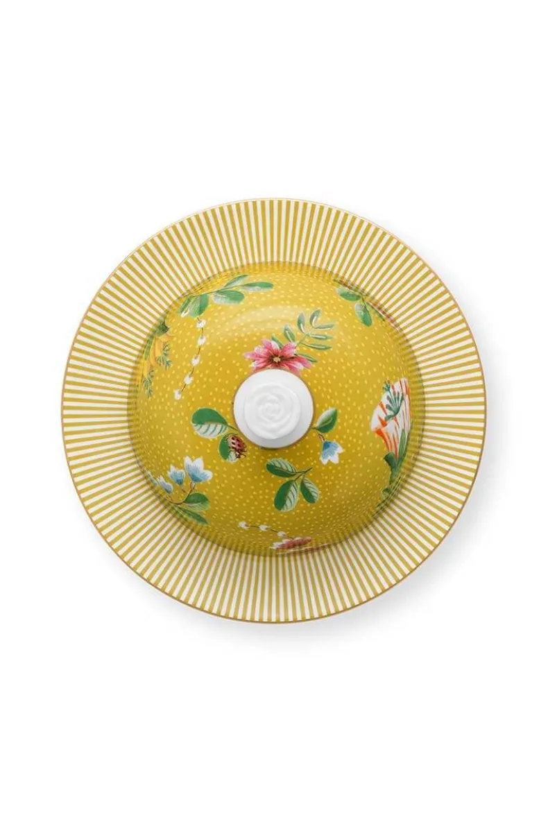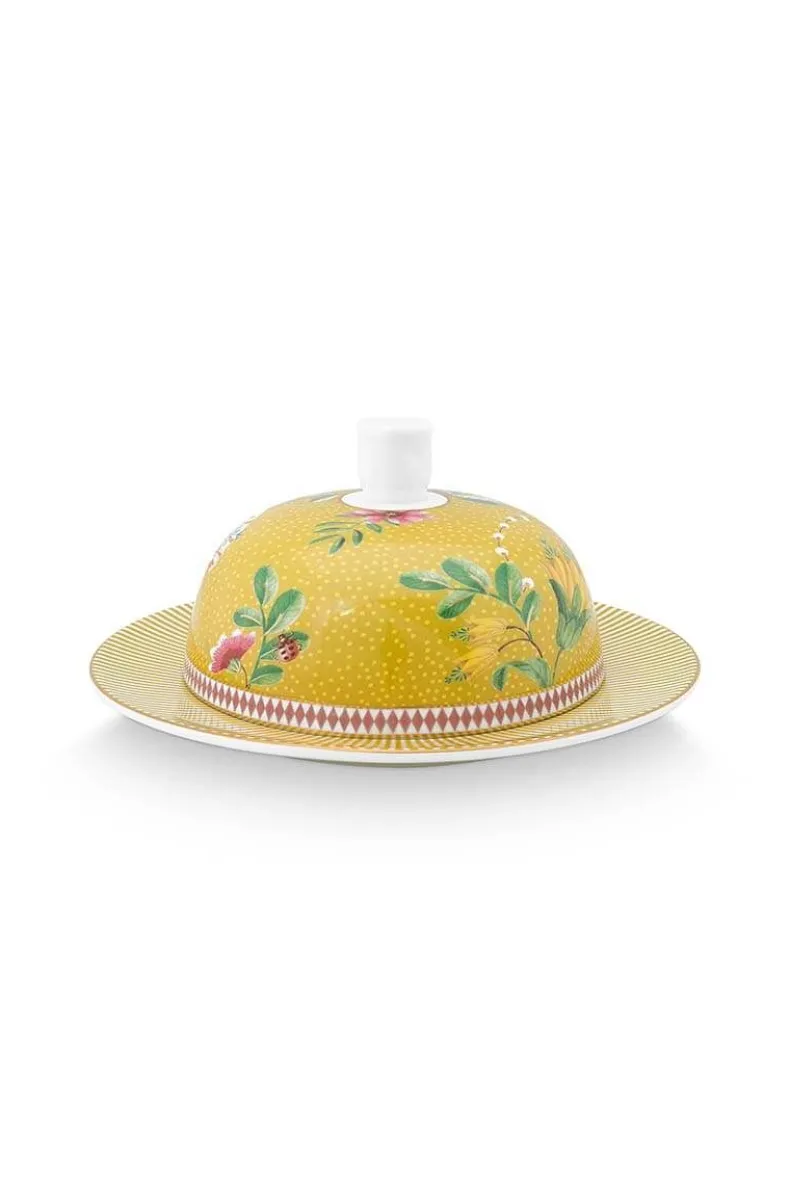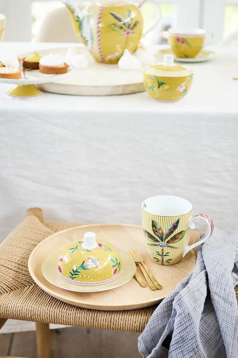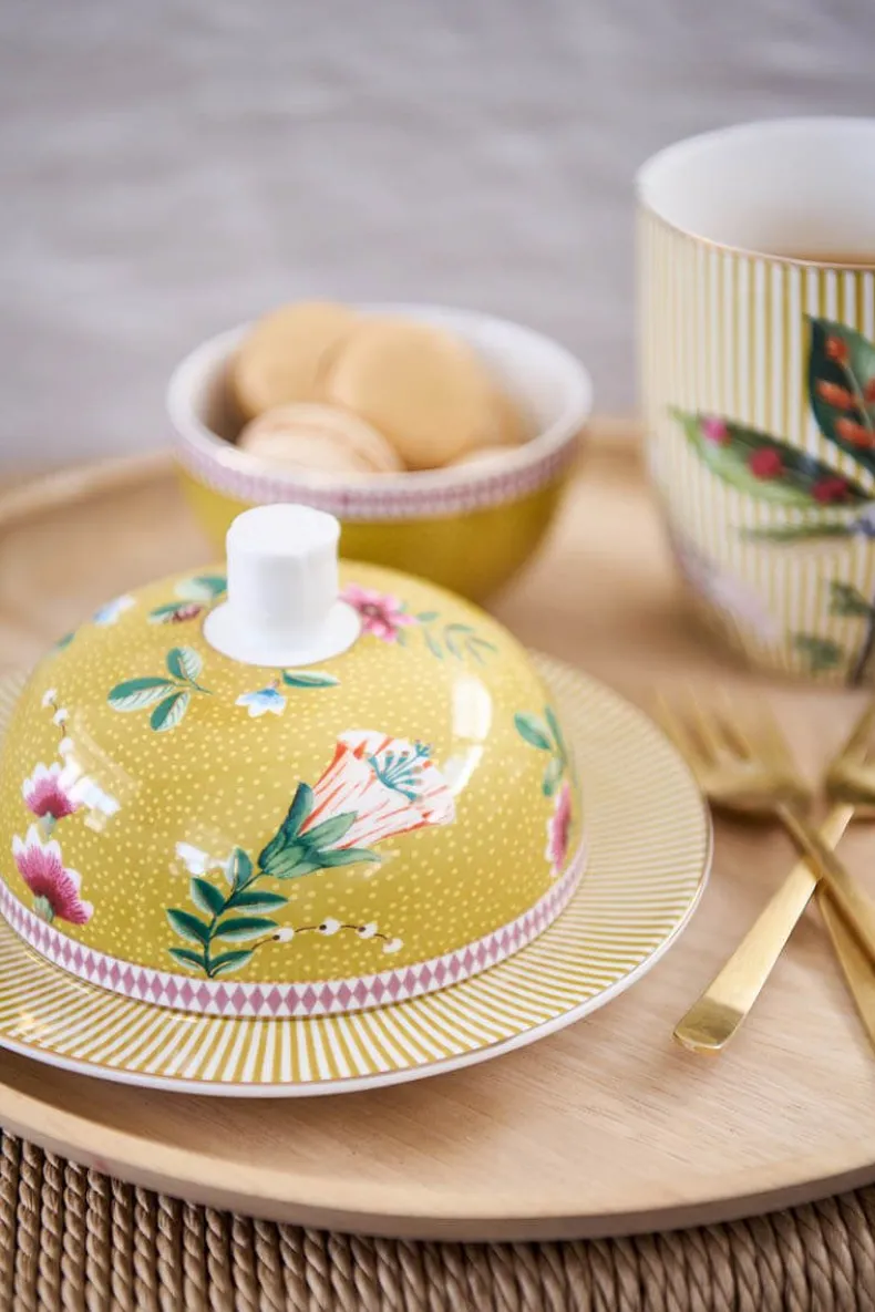 Deze La Majorelle Botervloot Is Versierd Met Exotische Bloemen Op Een Gele Achtergrond.