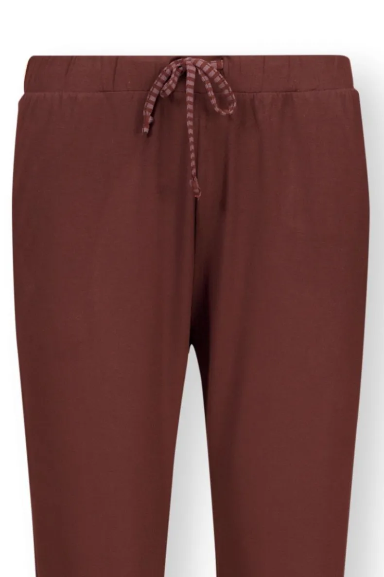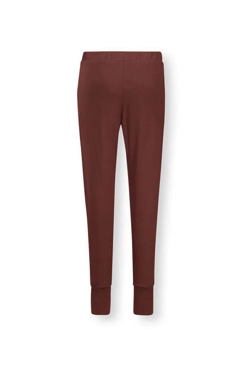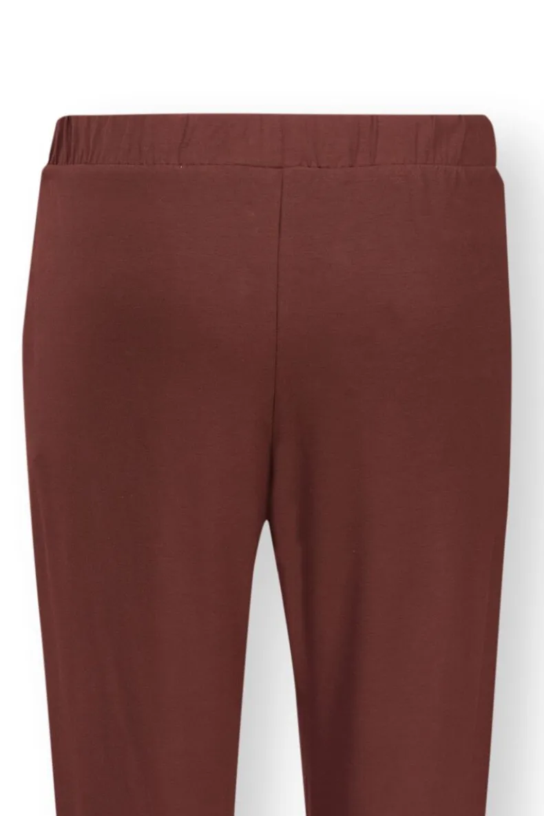 Deze Lange Broek In Het Terra Rood Is Uitgevoerd Met Het Simpele Solid Dessin. De Taille Is Elastisch En Heeft Een Koord Rondom Voor Ultiem Comfort.