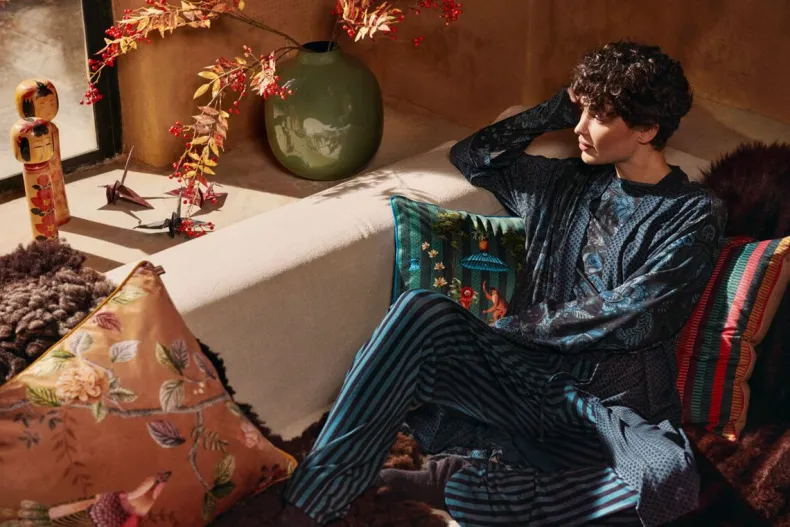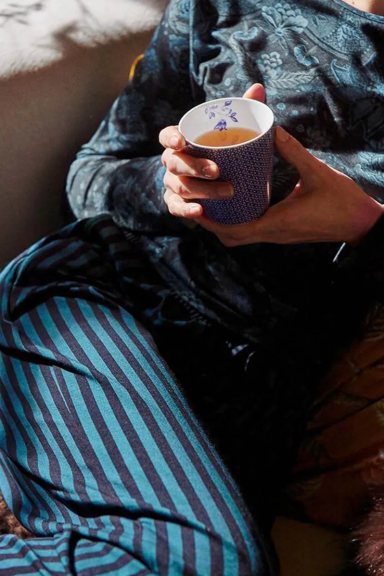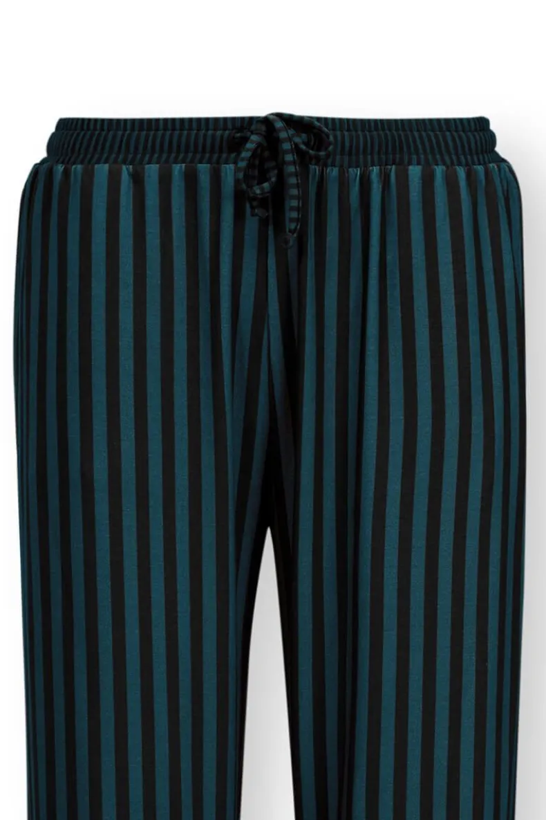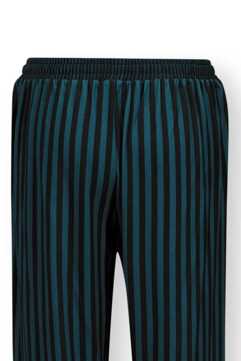 Deze Lange Broek In Het Donkerblauw Is Uitgevoerd Met Het Gestreepte Sumo Stripe Dessin. Het Herhaalde Dessin Is Opgebouwd Uit Symmetrische Strepen. De Taille Is Elastisch En Heeft Een Koord Rondom Voor Een Comfortabele Fit.