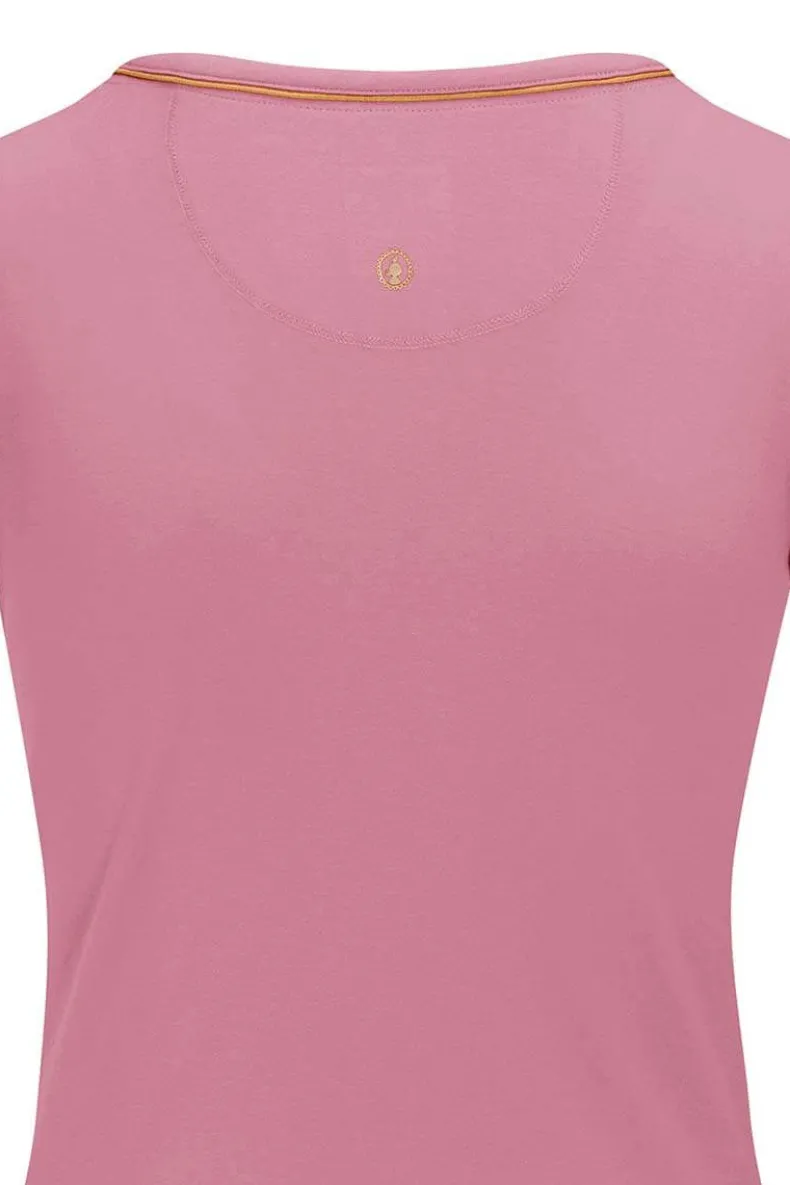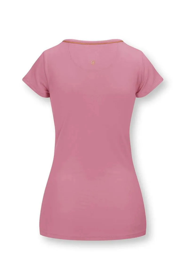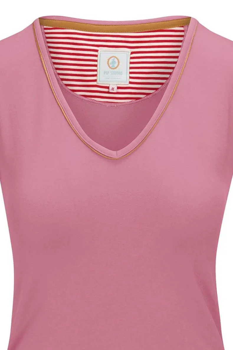 Deze Top Met Korte Mouwen In Roze Is Uitgevoerd Met Het Solid Dessin. De Top Heeft Een V-Hals.