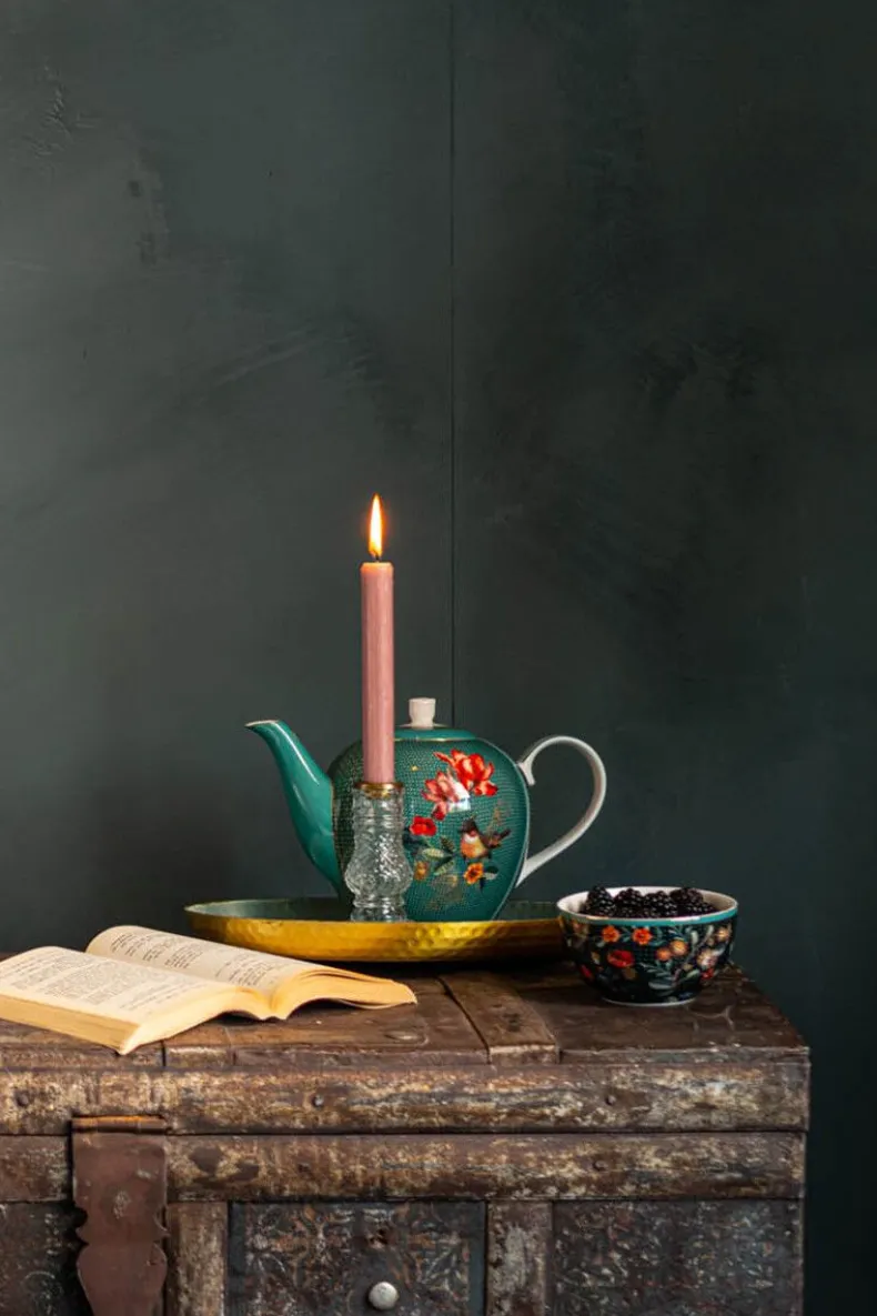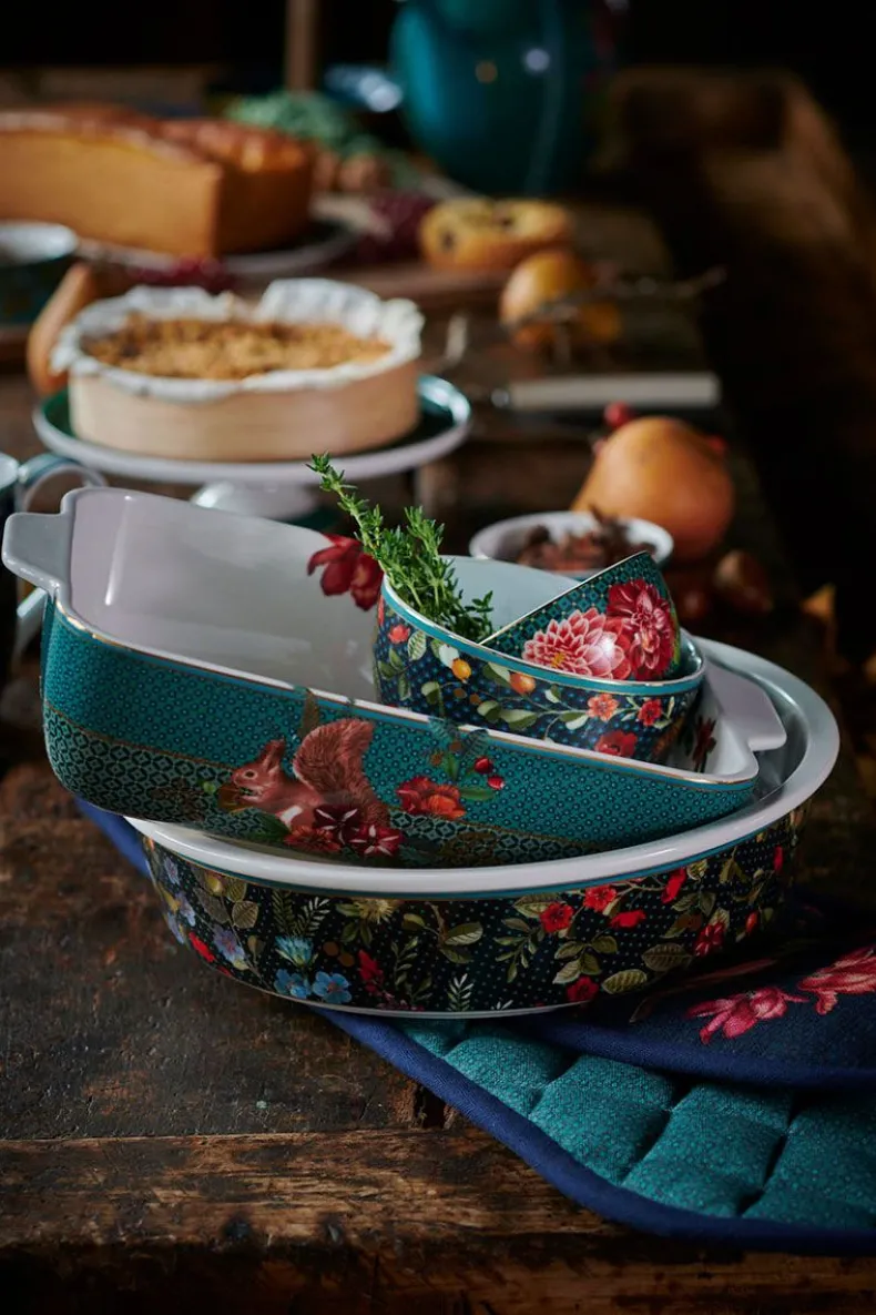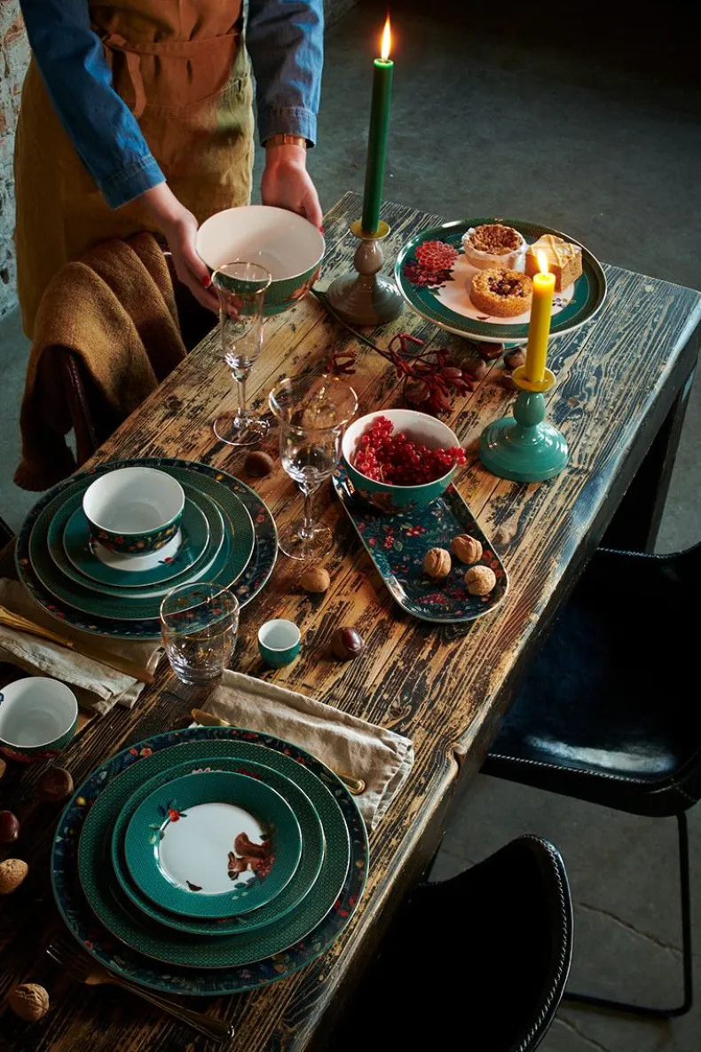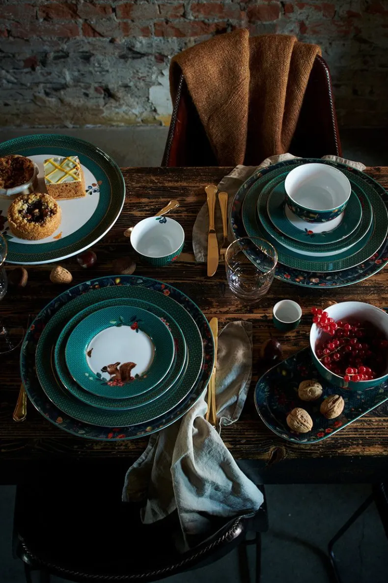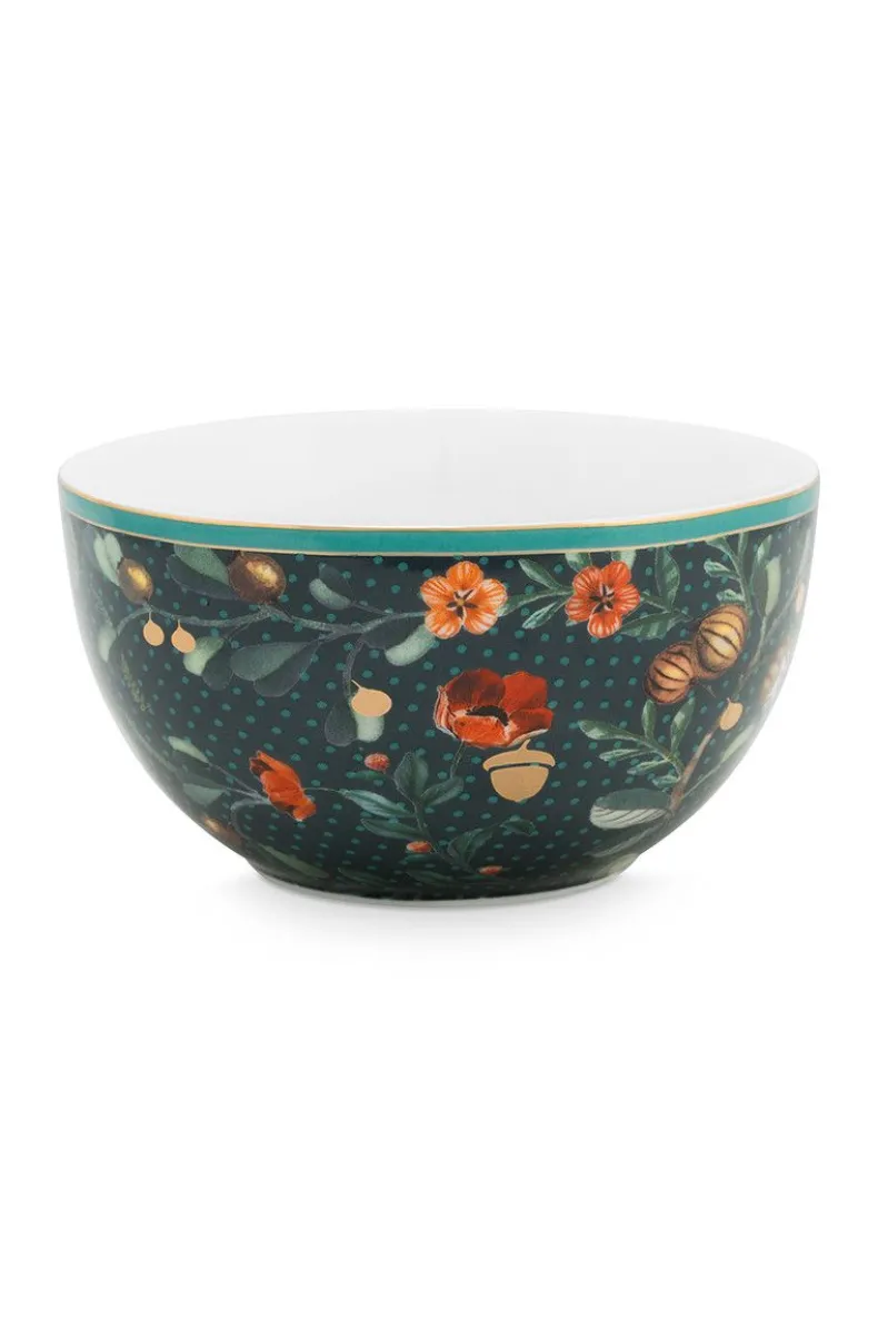 Een Groene Porseleinen Kom Uit Onze Winter Wonderland Collectie. Gedecoreerd Met Verschillende Soorten Bessen, Eikels En Seizoensbloemen Waarin Zich In Het Midden Een Gouden Vogel Bevindt.